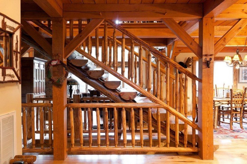 تم تجهيز عدد كبير جدًا من السلالم الخشبية المؤدية إلى الطابق الثاني ، والتي يمكن العثور على صور لها في أي مكان ، بأسوار ودرابزين. يتم دعمها بواسطة أرفف يتم تثبيت عناصر زخرفية مختلفة بينها. من بينها ، الأكثر شيوعًا هي الدرابزينات المنحوتة على شكل عمود غريب. في بعض الأحيان توجد خيارات يتم فيها ملء الفراغ بين المنشورات بعناصر منقوشة مزورة. إنها تنسجم تمامًا مع الهيكل الخشبي الضخم للسلالم.