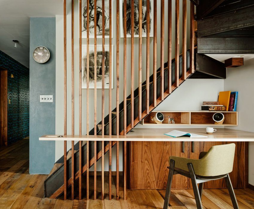 ينشئ بعض المصممين منطقة جلوس مريحة تحت الدرج. الأطفال يحبونه بشكل خاص. يمكنك حتى وضع طاولة هناك ، وإنشاء مكتب صغير للعمل. لا أحد يمنع إنشاء أرفف للكتب هناك من خلال إنشاء مكتبة. الشيء الرئيسي هو أن هذا الهيكل بأكمله لا يجعل المظهر الكامل للسلالم أثقل ، ولا يجعله مرهقًا للغاية ولا يحد من إمكانيات تنظيف الغرفة.
