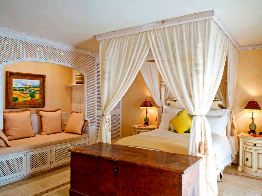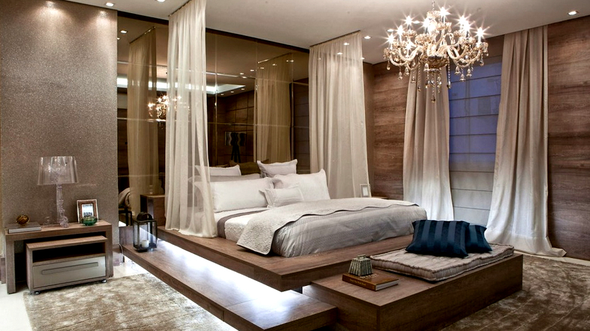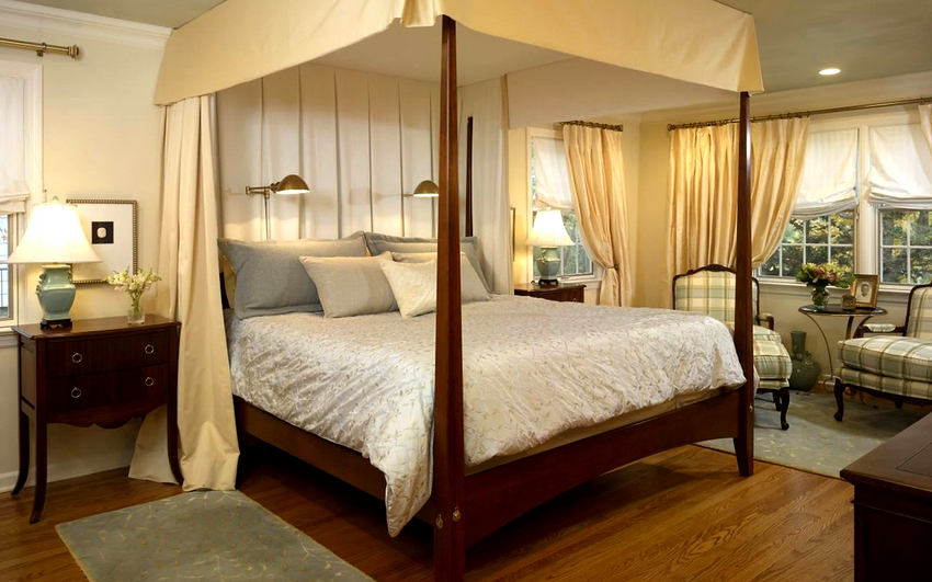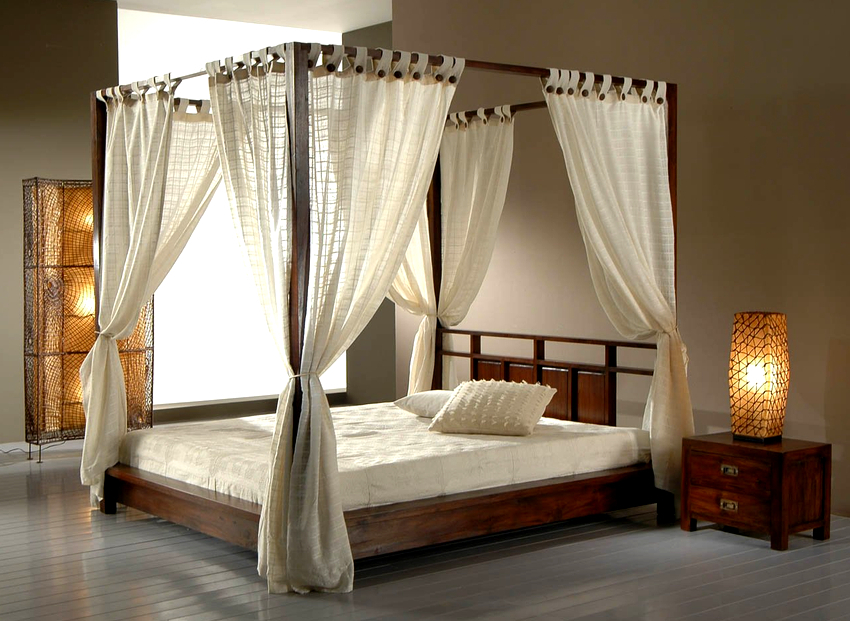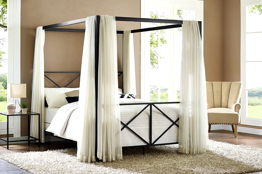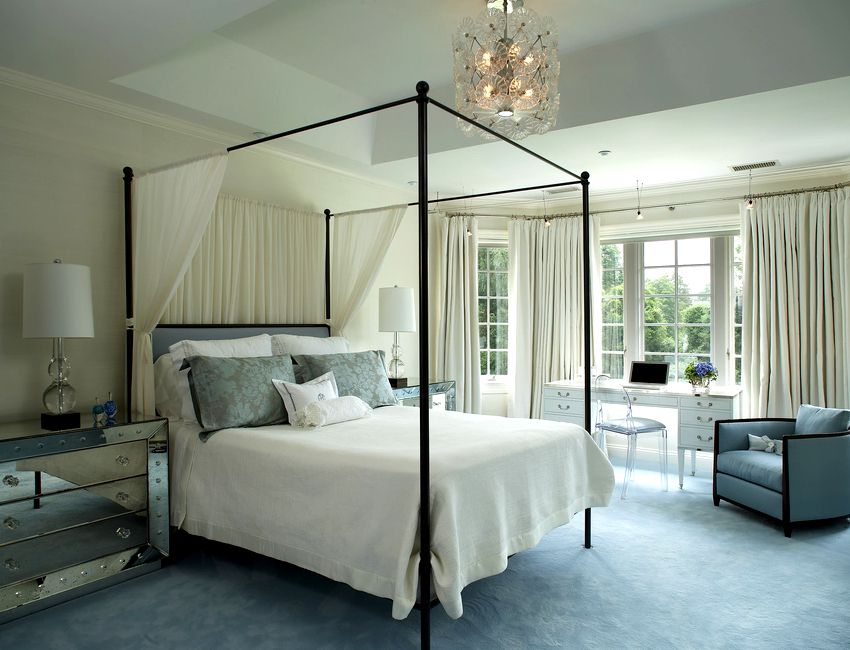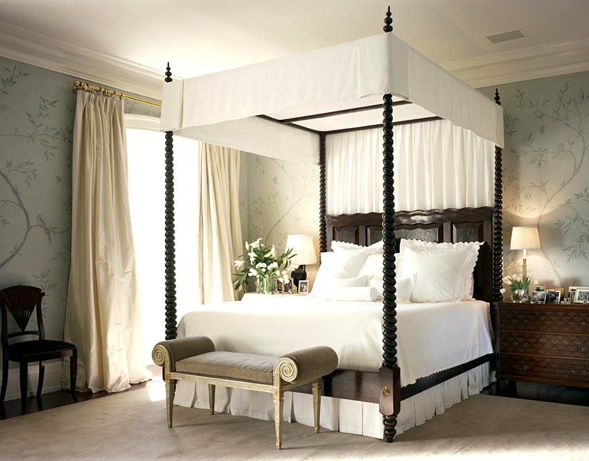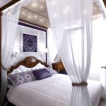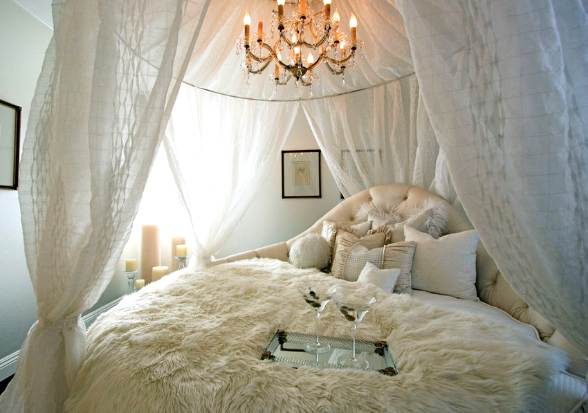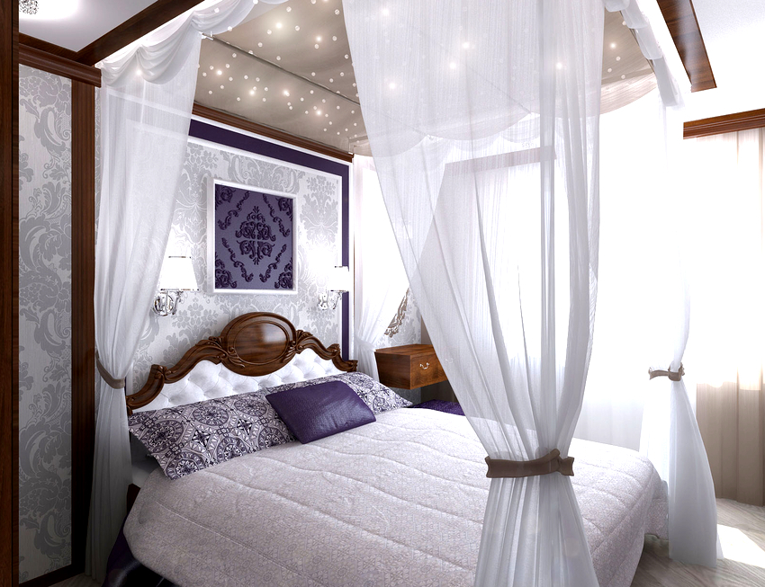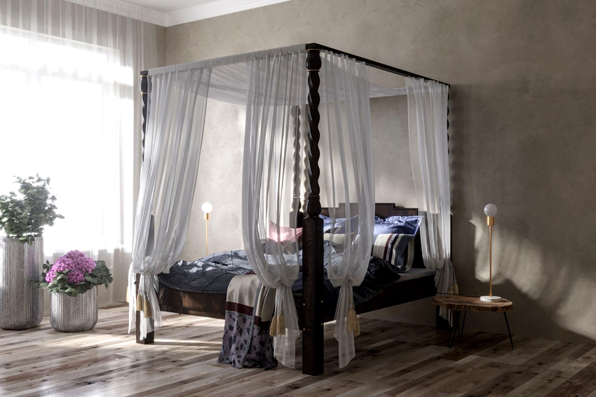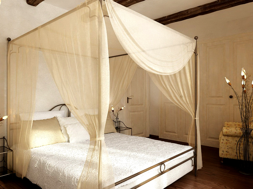 السرير مع الستائر له ميزة أخرى. بمساعدتهم ، يمكنك خلق جو رومانسي في غرفة النوم ، وملء الغرفة بالخفة والخفة. علاوة على ذلك ، يمكنك بسهولة صنع مظلة فاخرة بيديك ، لأنه لا يتطلب الأمر الكثير من الجهد لإنشاء مظلة بيديك. لكن مثل هذا العنصر الداخلي سيصبح زخرفة فاخرة لغرفة النوم.