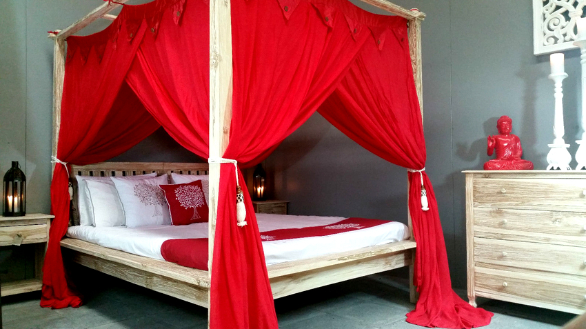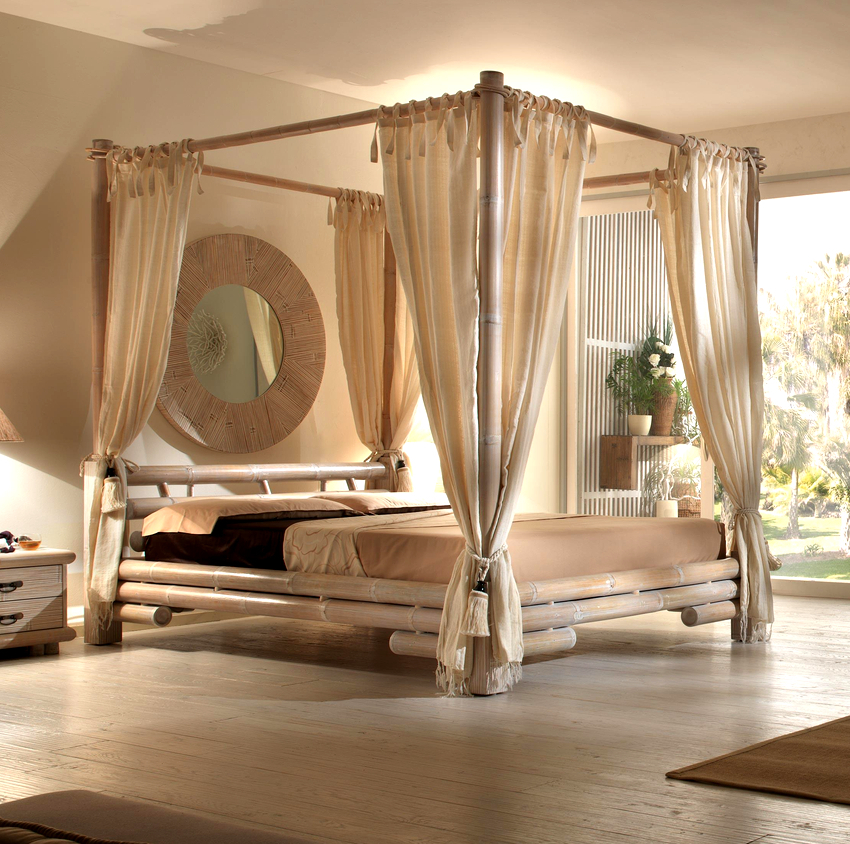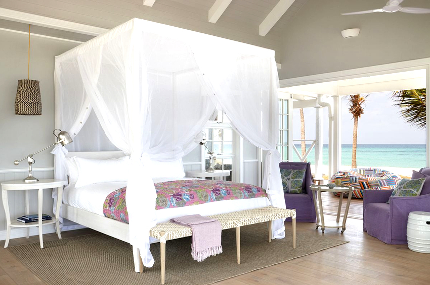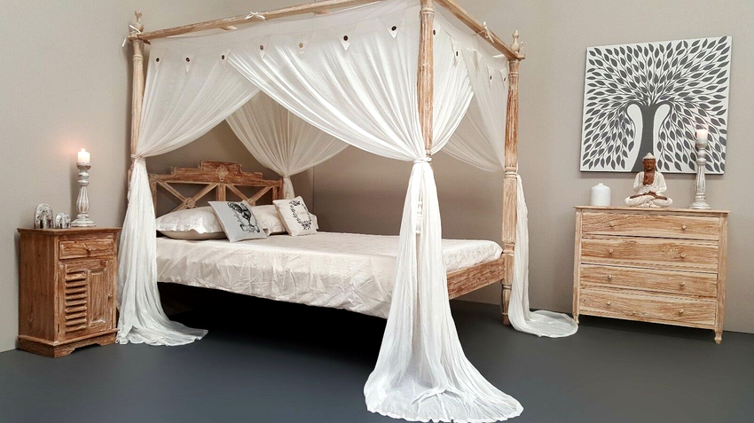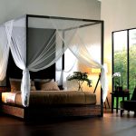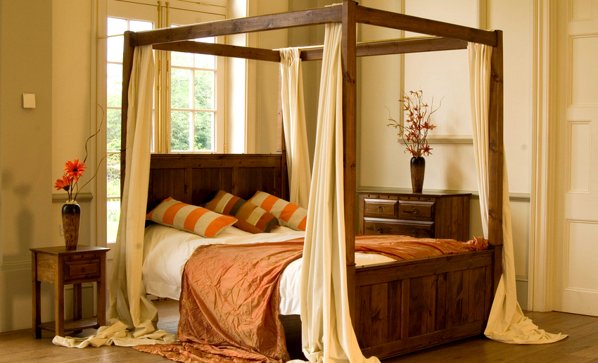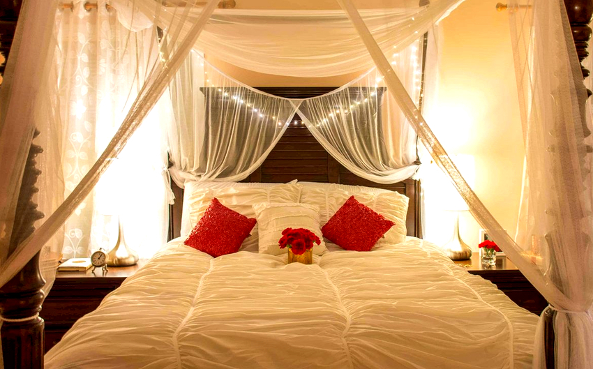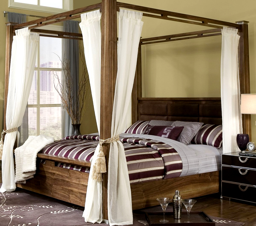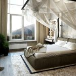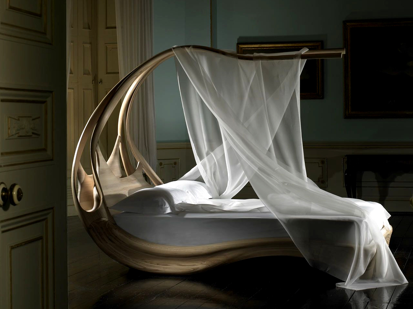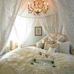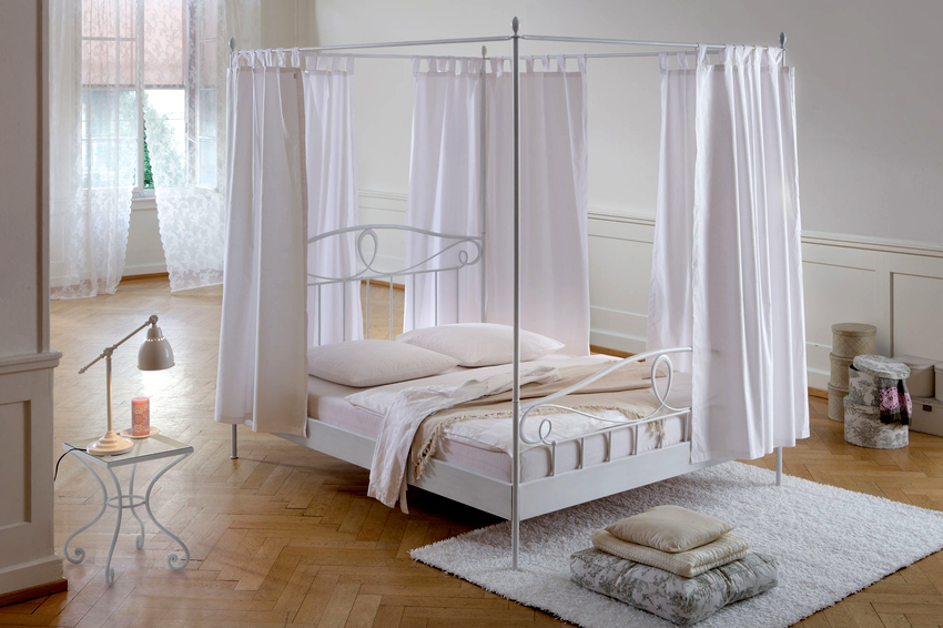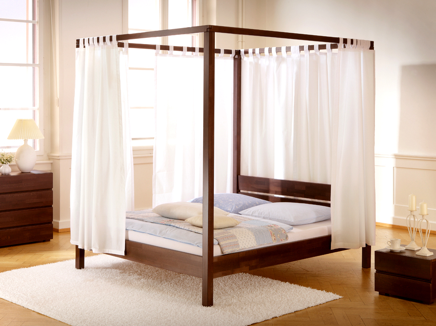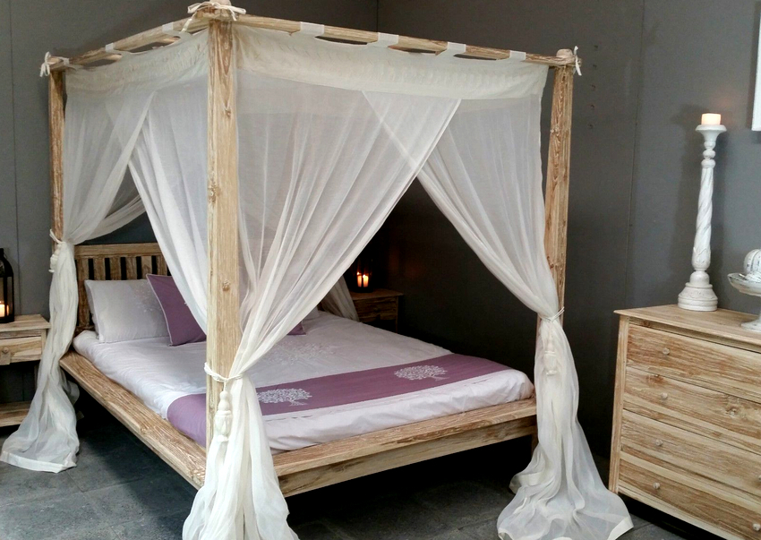 السرير مع الستائر له ميزة أخرى. بمساعدتهم ، يمكنك خلق جو رومانسي في غرفة النوم ، وملء الغرفة بالخفة والخفة. علاوة على ذلك ، يمكنك بسهولة صنع مظلة فاخرة بيديك ، لأنه لا يتطلب الأمر الكثير من الجهد لإنشاء مظلة بيديك. لكن مثل هذا العنصر الداخلي سيصبح زخرفة فاخرة لغرفة النوم.
