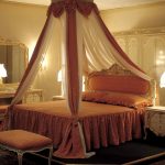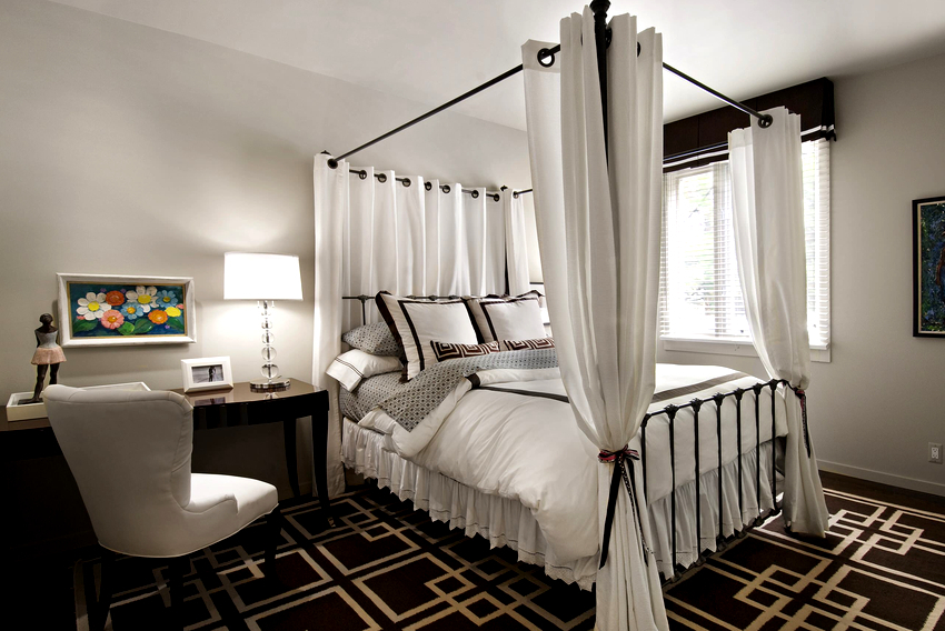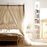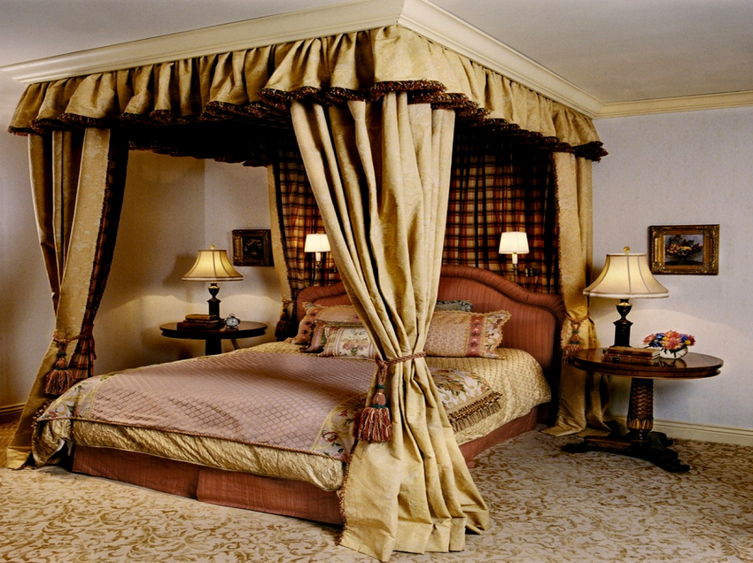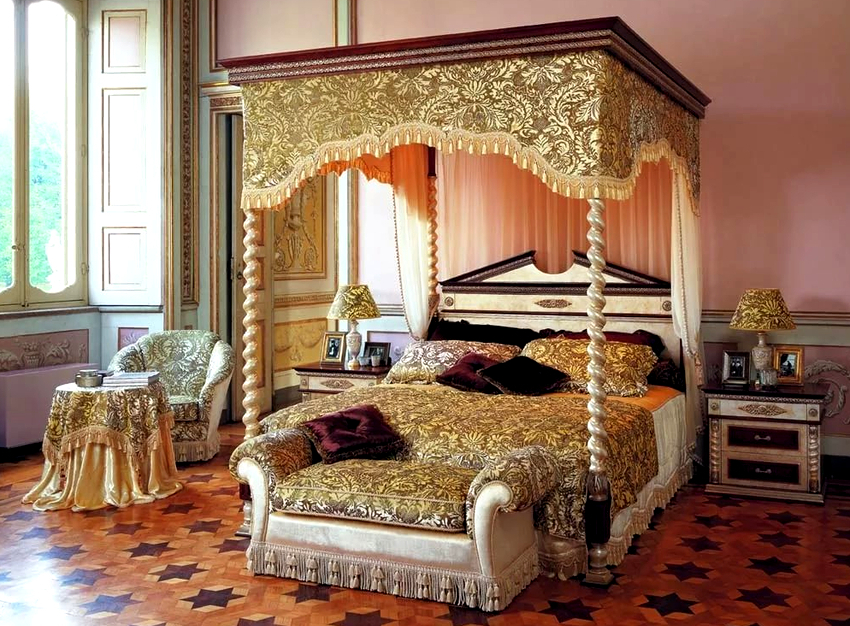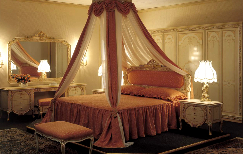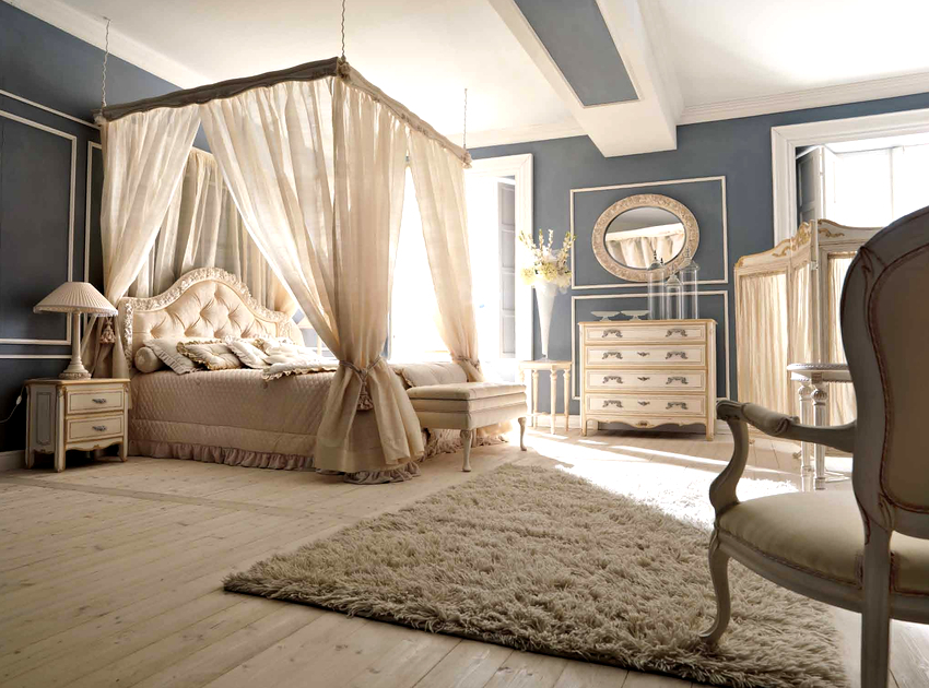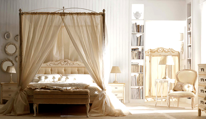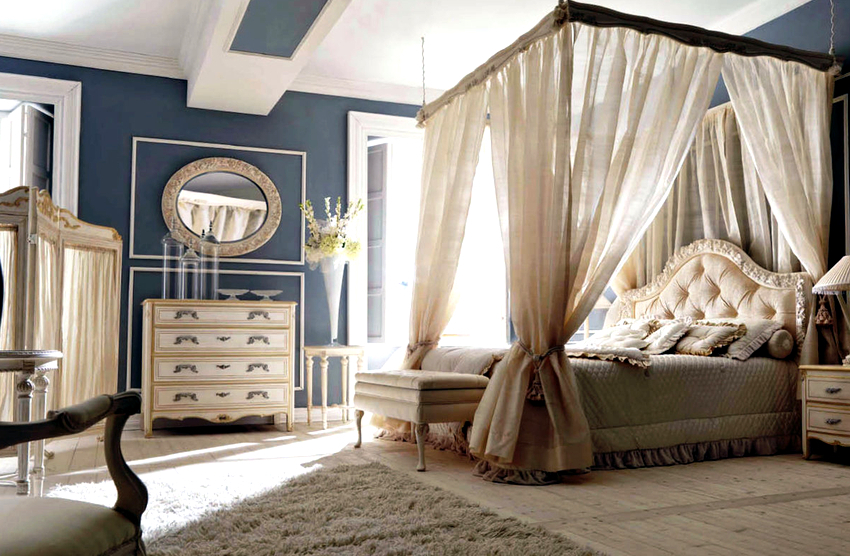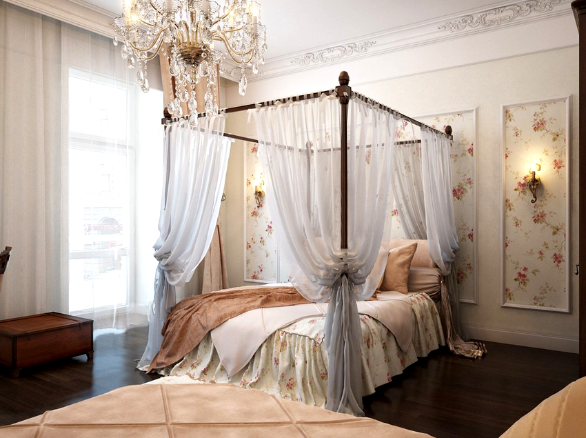 ليس من الضروري الإشارة إلى النمط الكلاسيكي أو الباروك في داخل الغرفة. تُستخدم المظلة لإبراز السرير مقابل الخلفية العامة ، لكن هذا الحل يجب ألا يضر بالبيئة العامة.