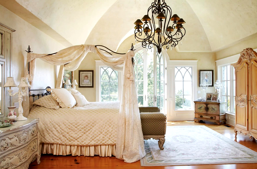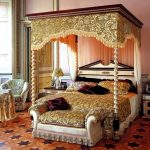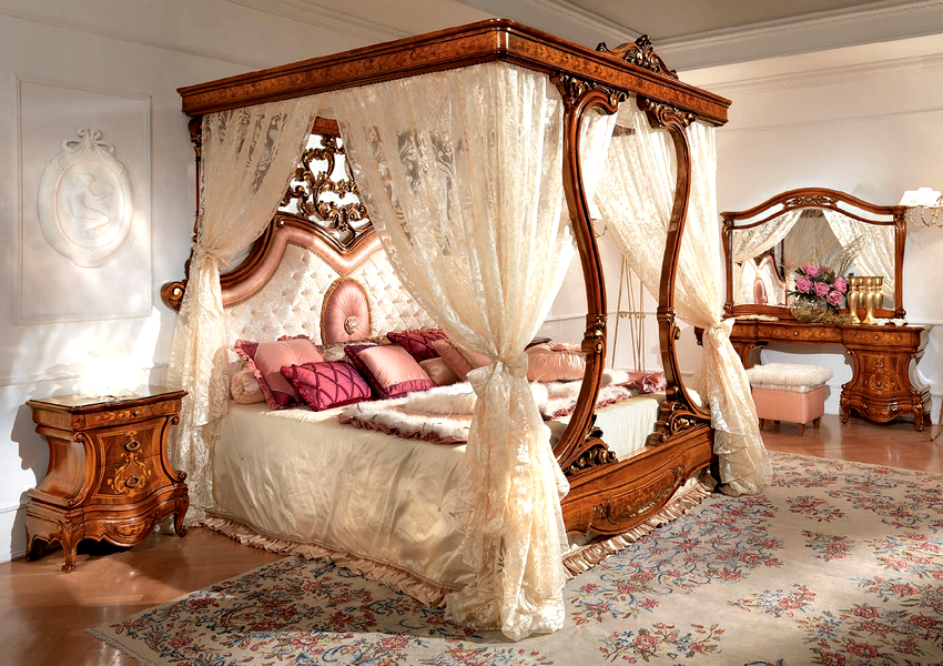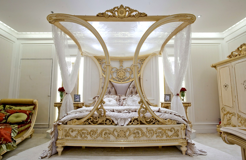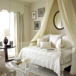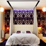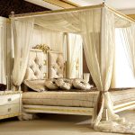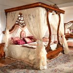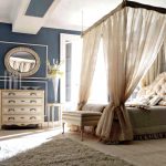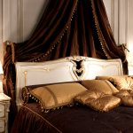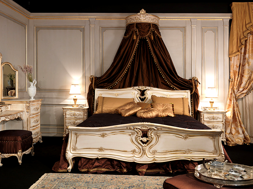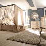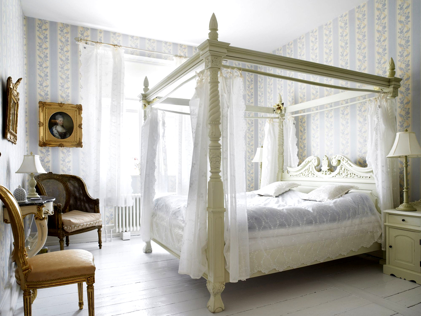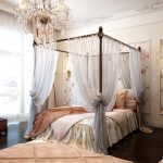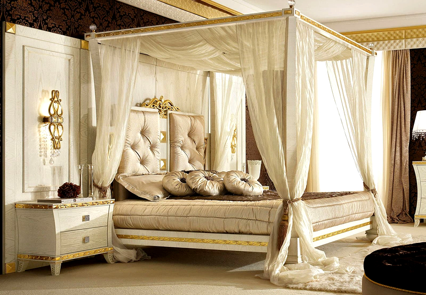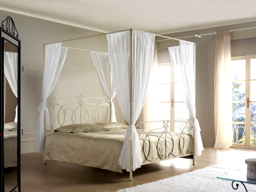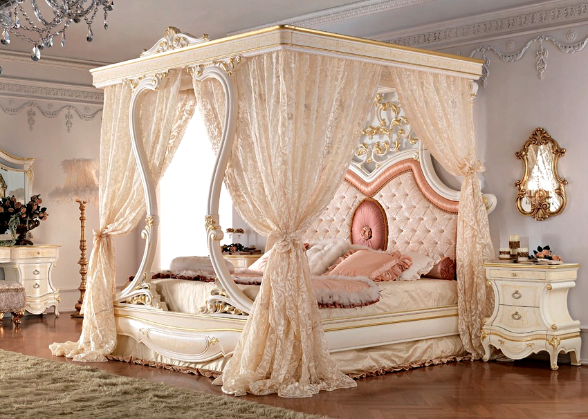 ليس من الضروري الإشارة إلى النمط الكلاسيكي أو الباروك في داخل الغرفة. تُستخدم المظلة لإبراز السرير مقابل الخلفية العامة ، لكن هذا الحل يجب ألا يضر بالبيئة العامة.