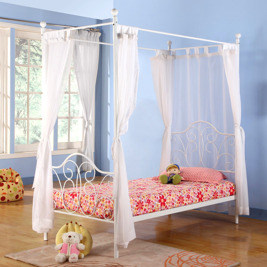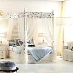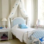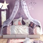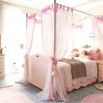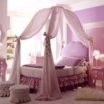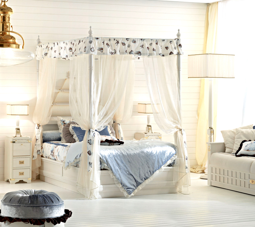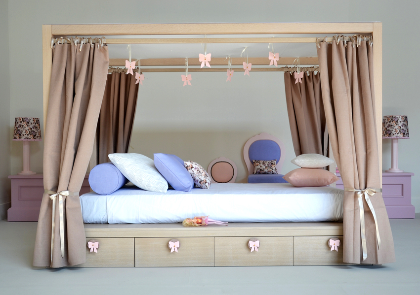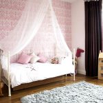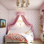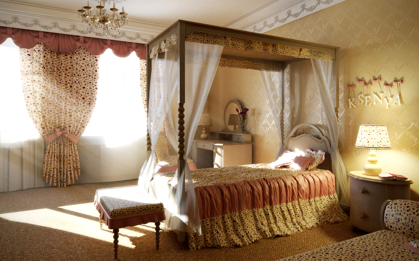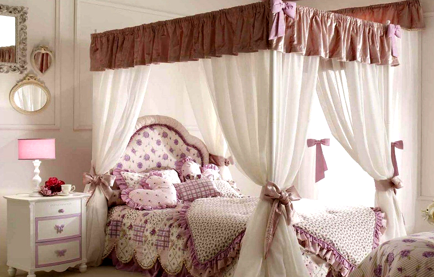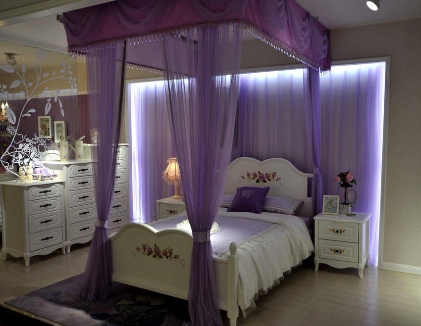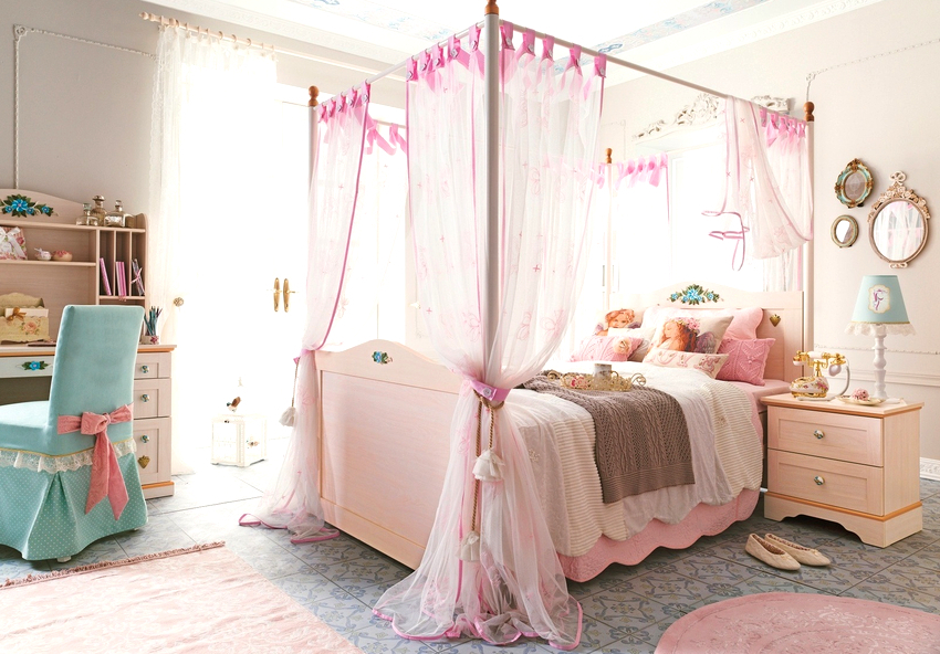 بالإضافة إلى ذلك ، في غرفة فتاة مراهقة ، يمكنك تثبيت سرير يتم فيه تثبيت المظلة بأربع نقاط. يسمى خيار التصميم هذا "ملكي".