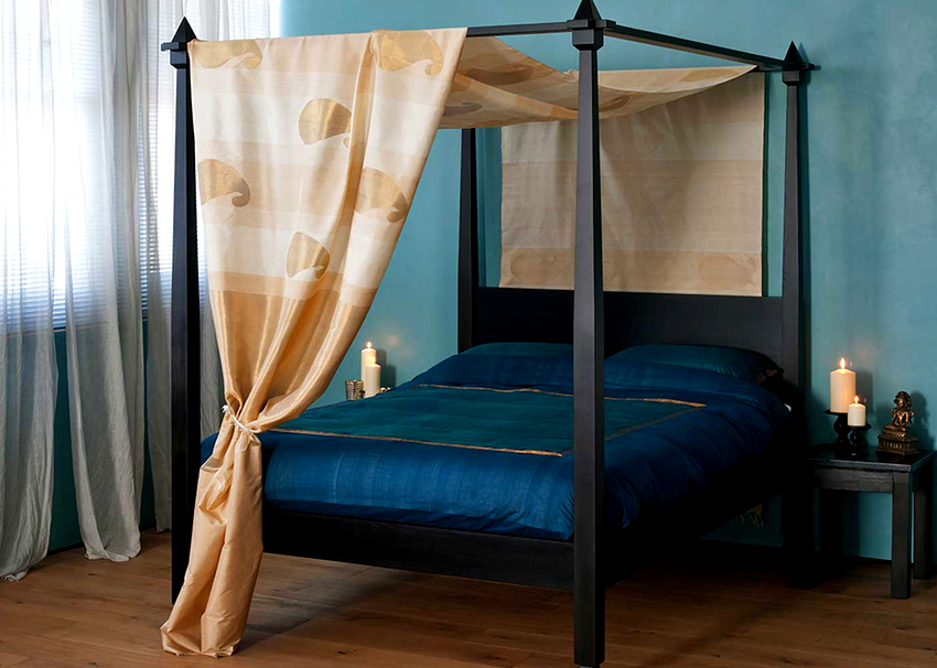 في غرفة نوم البالغين ، ستتماشى المظلة بشكل جيد مع الطراز الشرقي. بالنسبة لمثل هذه الأماكن ، فإن النموذج المصنوع من القماش الكثيف والداكن ، والمزين بأنماط وزخارف مخرمة مناسب.