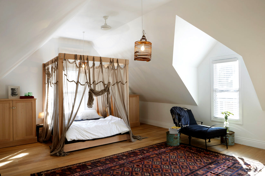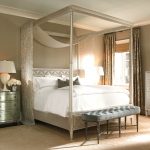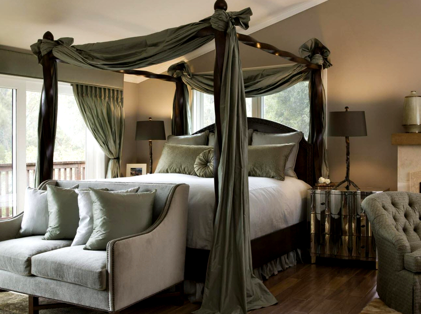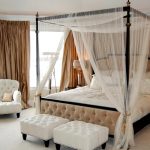 يجب دمج القماش السميك على المظلة في غرفة النوم مع التنجيد على الأثاث ، على سبيل المثال ، العثمانيين أو الكراسي بذراعين أو الأرائك.