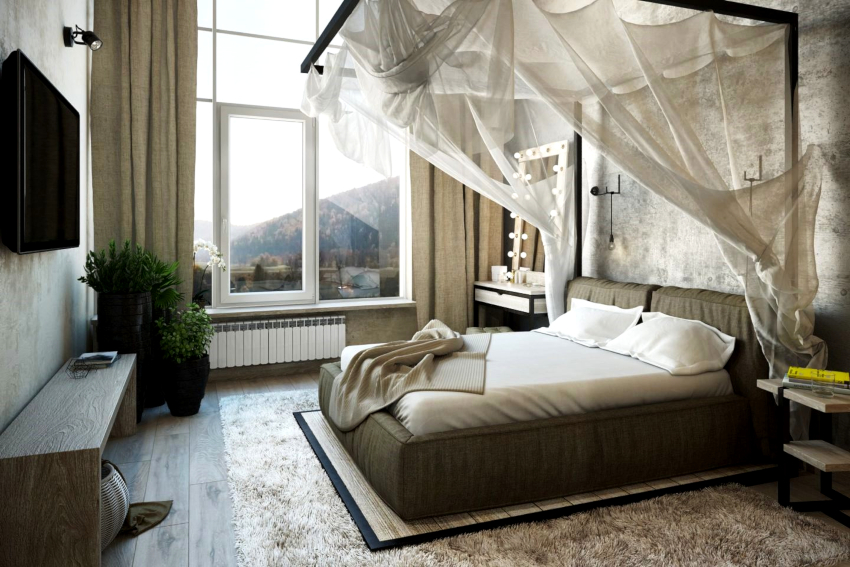 نصائح مفيدة! لإنشاء تصميم متناغم لغرفة النوم مع مظلة فوق السرير ، يُنصح بترتيب الستائر على النوافذ والستائر الأخرى بنفس نظام الألوان.