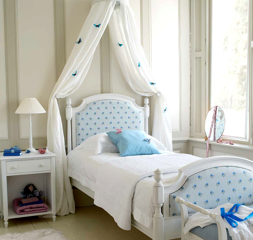 عند اختيار مظلة لغرفة الأطفال ، عليك الانتباه إلى لون المنتج ومكونه الزخرفي