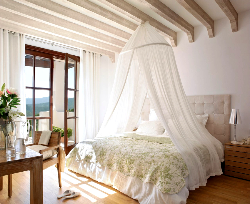 يفضل العديد من مالكي شقق المدينة والمنازل الريفية غرف نوم على طراز بروفانس. سيبدو السرير الأبيض المتوج بمظلة مع ستائر خفيفة شفافة في مثل هذا التصميم الداخلي أنيقًا للغاية.