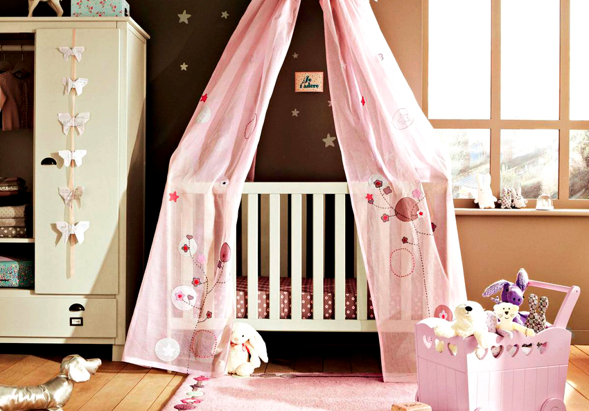 مظلة في غرفة الأطفال لا يسمح لك فقط بإنشاء تصميم أصلي ، ولكن أيضًا لحماية الطفل من الشمس والذباب والبعوض
