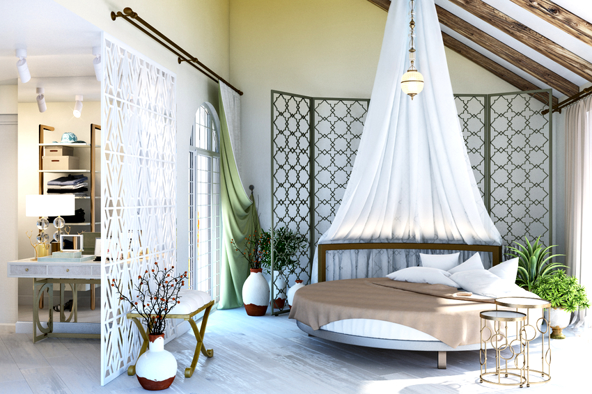 تبدو المظلة المثبتة فوق السرير المستدير مثيرة للاهتمام ومبتكرة للغاية