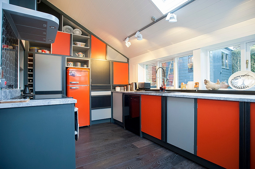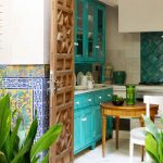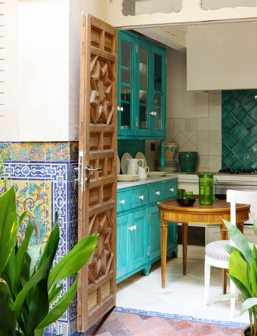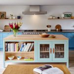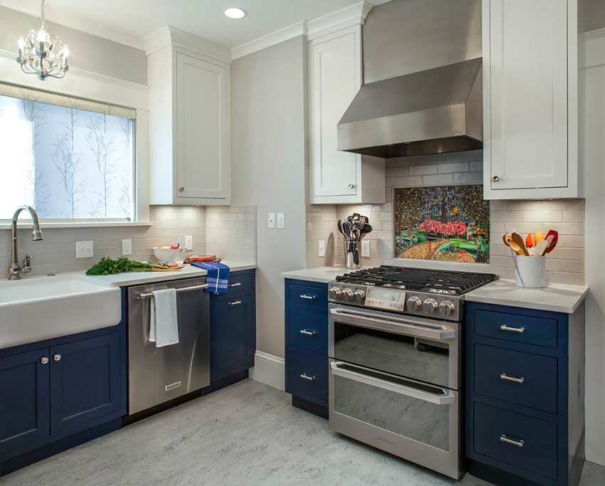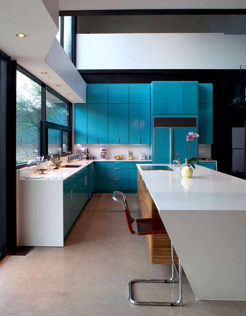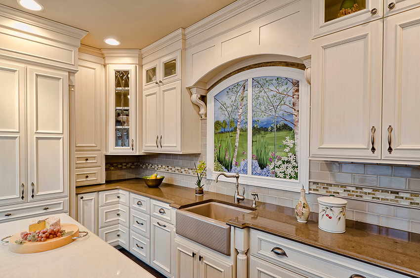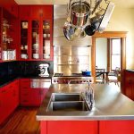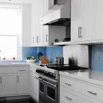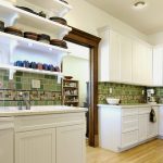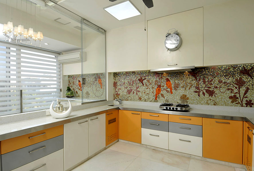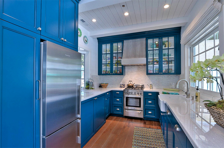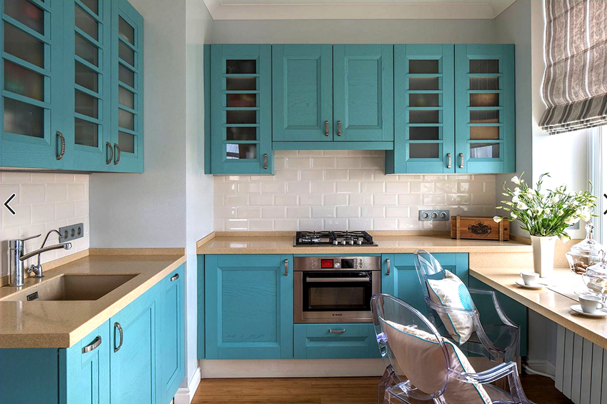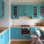 - ستضيف واجهة خزانة الزاوية ، المصنوعة من الزجاج الملون أو المزودة بباب عاكس ، لمسة غريبة إلى داخل المطبخ.