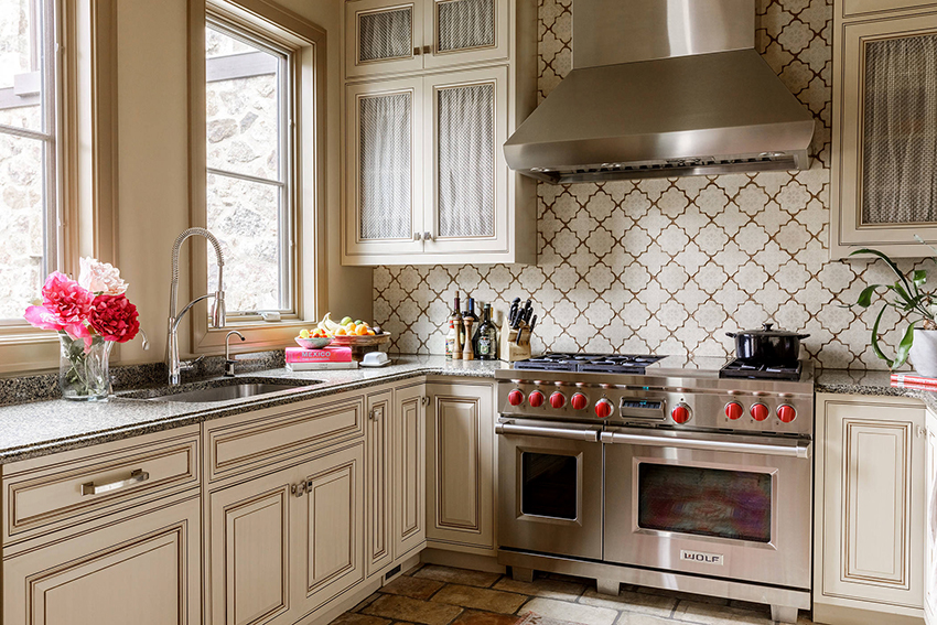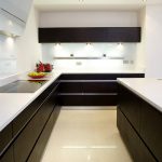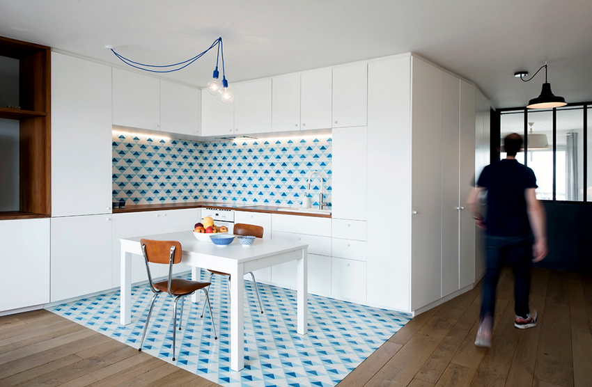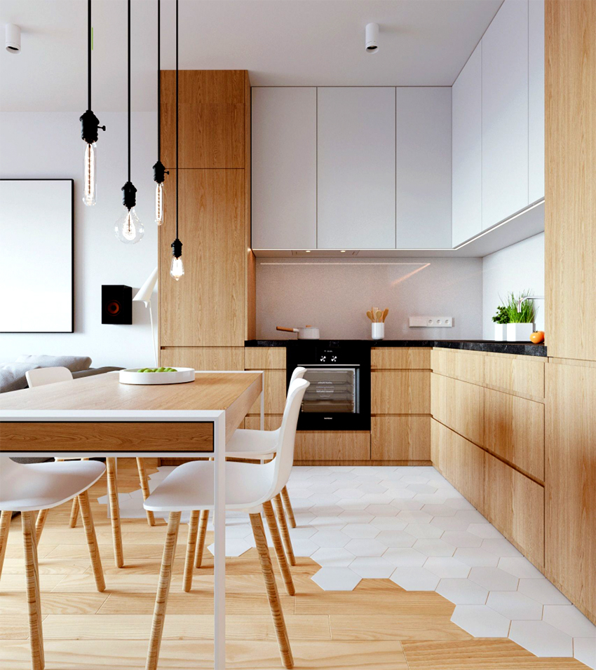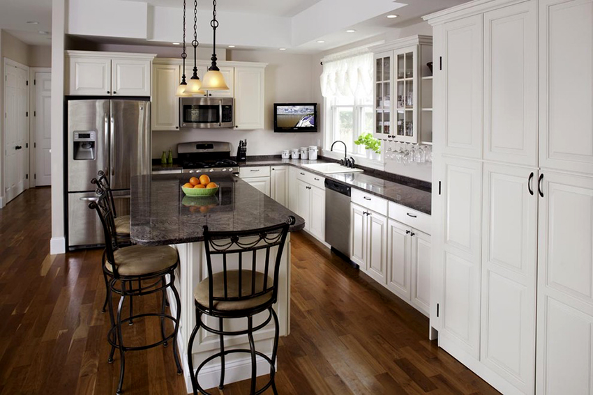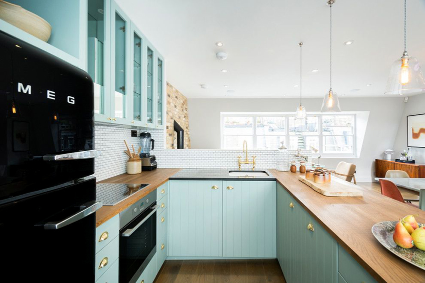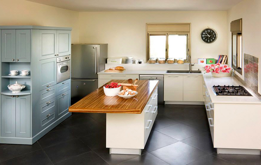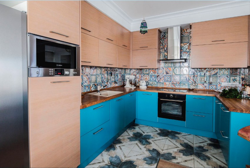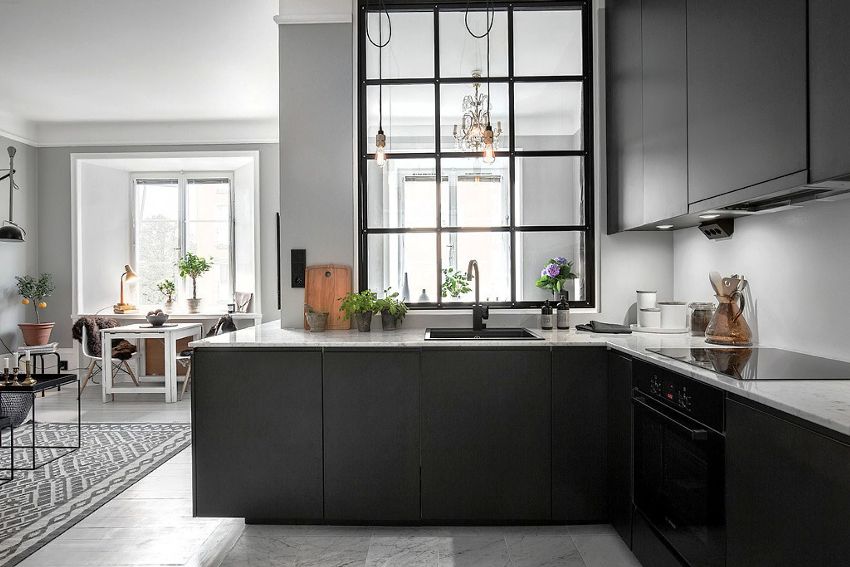 يتيح لك ترتيب الأثاث على شكل حرف L تنظيم منطقة مثلث العمل بشكل متناغم ، والذي يتكون من الوضع الصحيح للحوض والموقد والثلاجة.