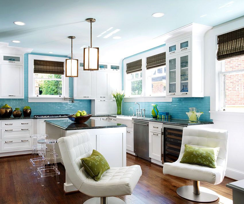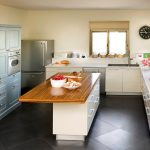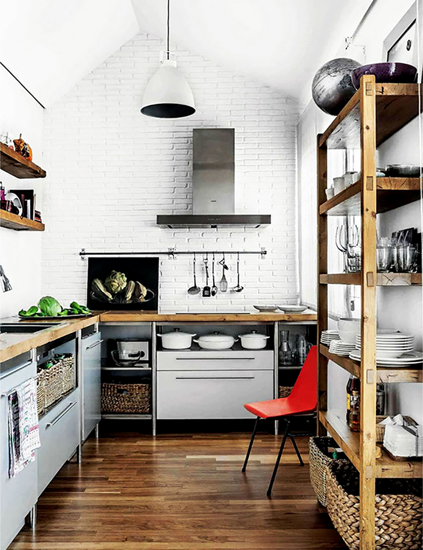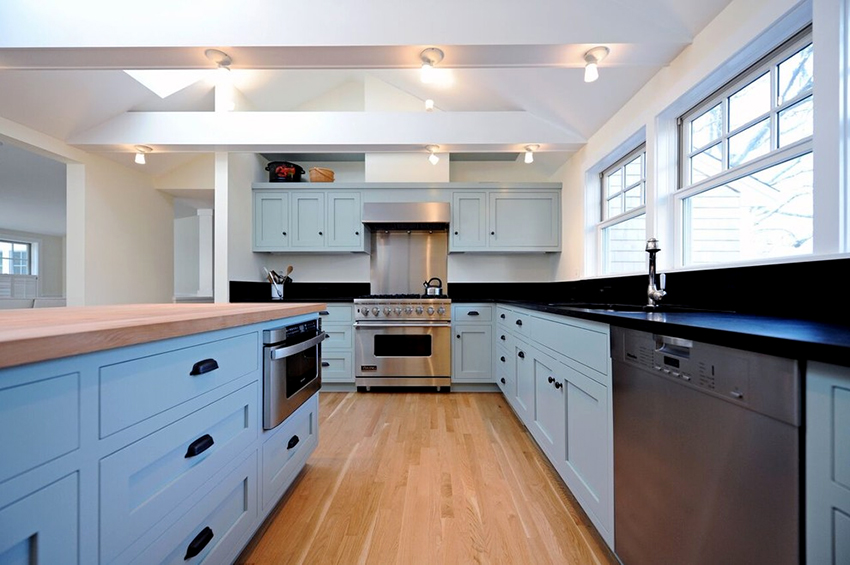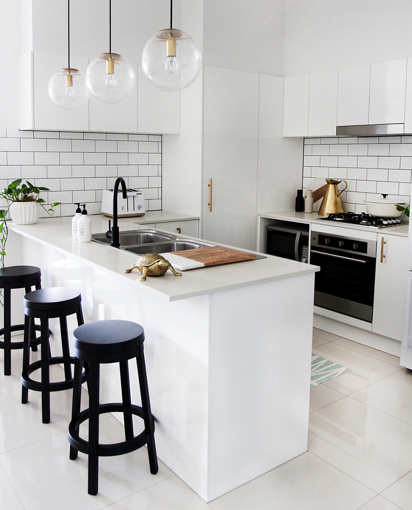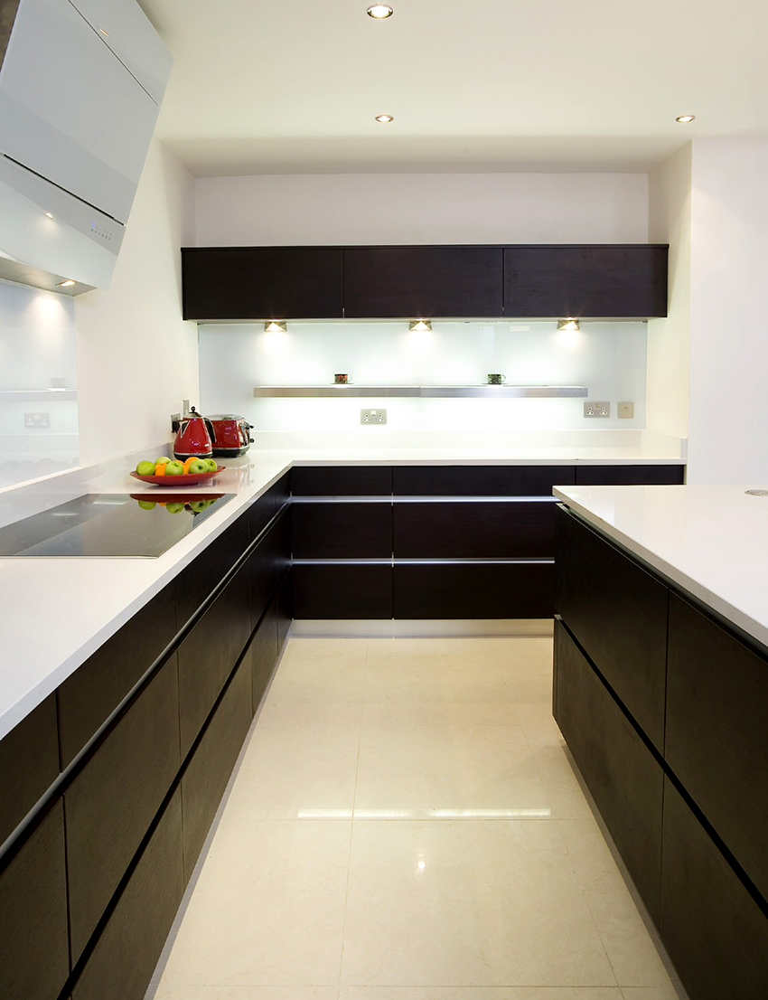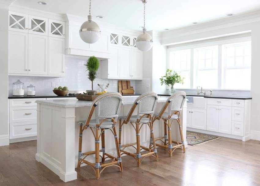 يتيح لك ترتيب الأثاث على شكل حرف L تنظيم منطقة مثلث العمل بشكل متناغم ، والذي يتكون من الوضع الصحيح للحوض والموقد والثلاجة.