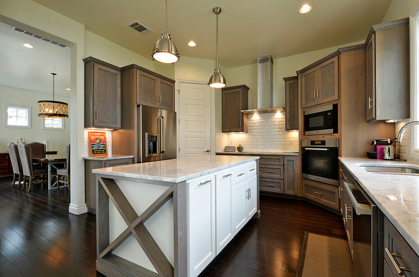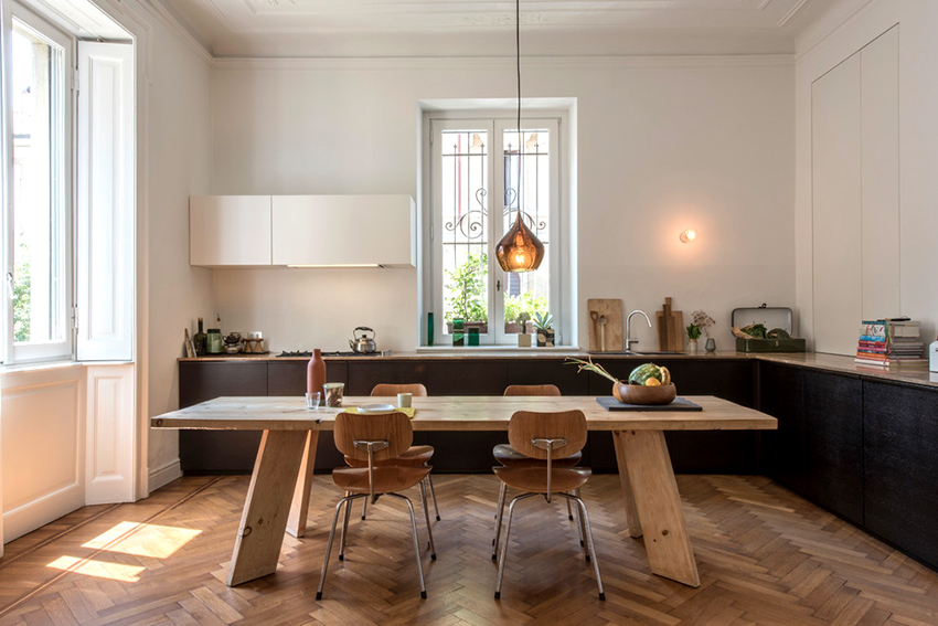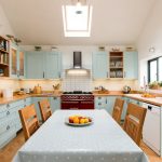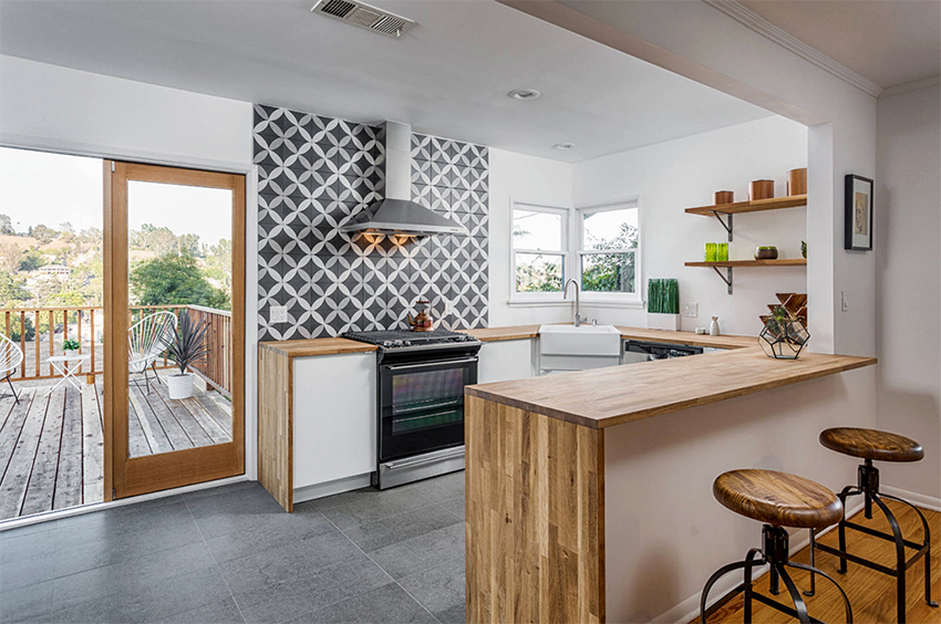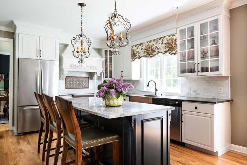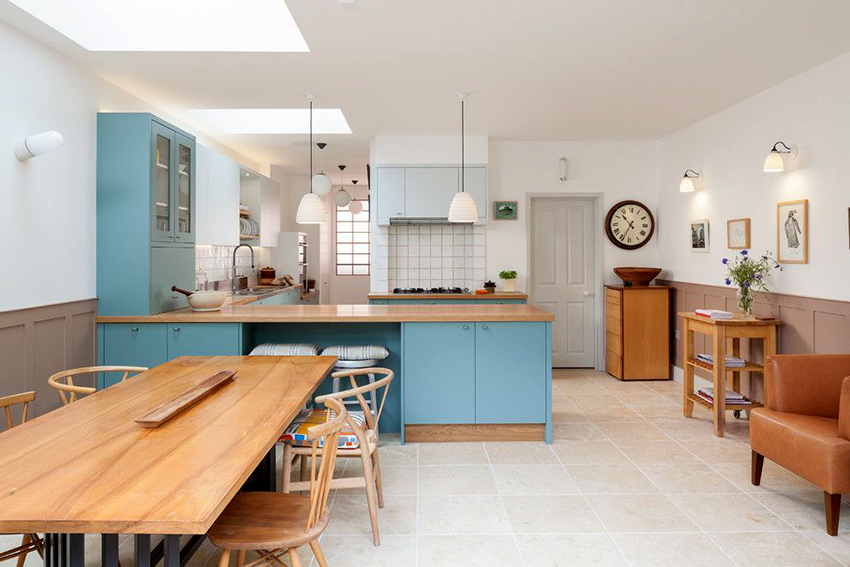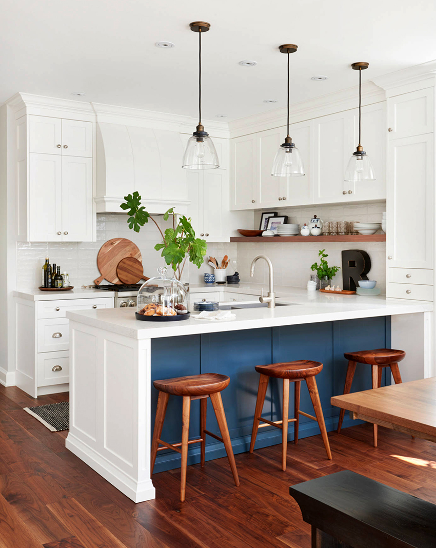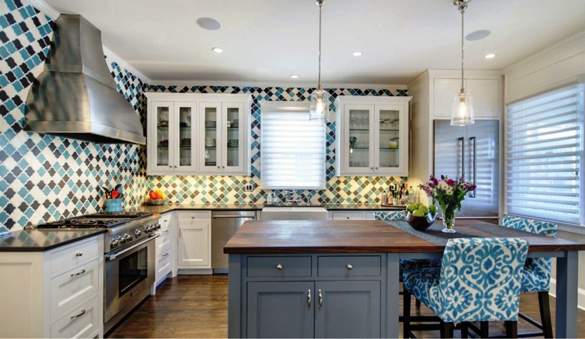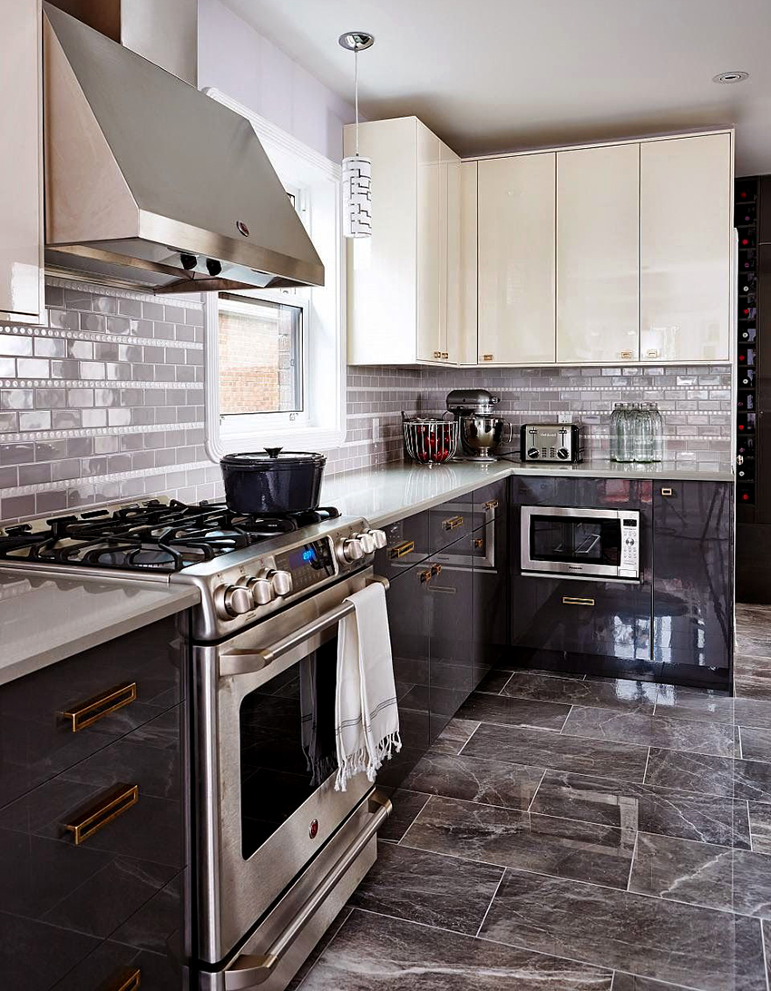 يتيح لك ترتيب الأثاث على شكل حرف L تنظيم منطقة مثلث العمل بشكل متناغم ، والذي يتكون من الوضع الصحيح للحوض والموقد والثلاجة.