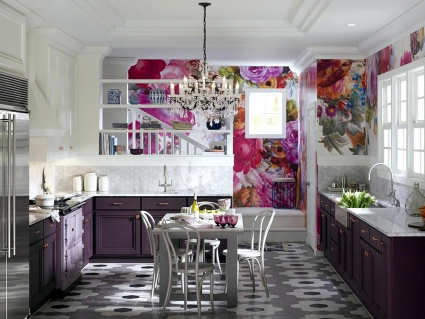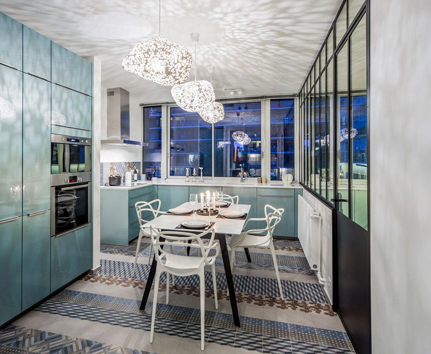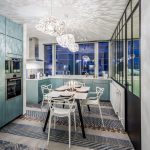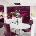 لتزيين منطقة تناول الطعام ، تحتاج إلى استخدام طاولة زاوية للمطبخ على شكل مثلث أو مستطيل أو مربع ، مما يملأ المساحة بشكل مثالي. من الأفضل إعطاء الأفضلية لكونترتوب زجاجي.