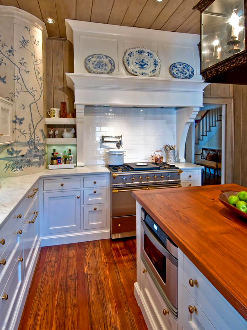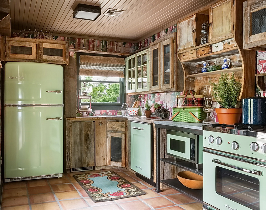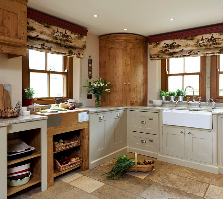 بلد. في هذه الحالة ، يكون تصميم مجموعة المطبخ الزاوية أكثر ملاءمة لتزيين غرفة تقع في منزل ريفي. يفضل استخدام المواد الطبيعية أيضًا. السمة المميزة لأثاث المطبخ على الطراز الريفي هي استخدام الأسطح القديمة. يتميز الطراز بوجود أرفف مفتوحة توضع عليها عناصر الديكور.