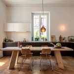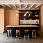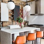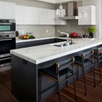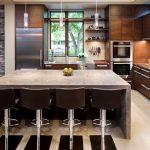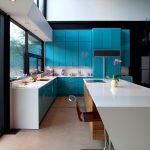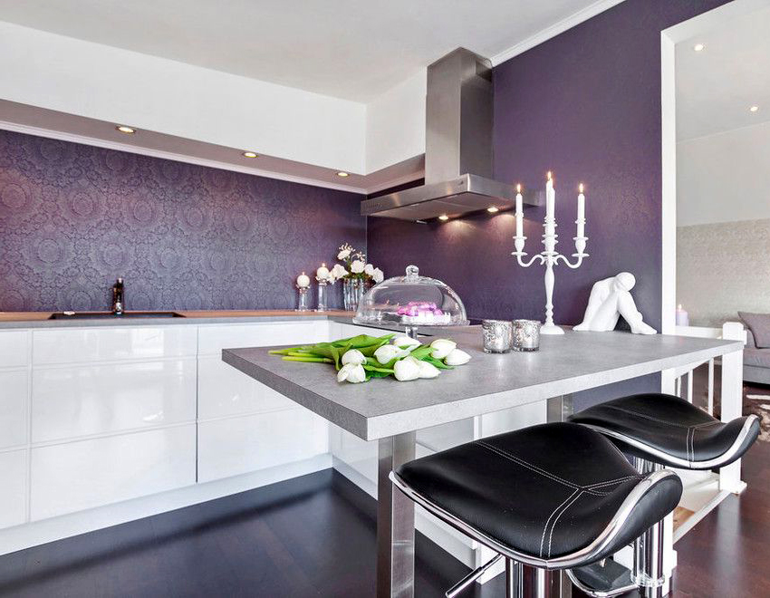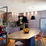 غالبًا ما يتم تثبيت مجموعة الزاوية مع جزيرة على طول أحد الجدران ، بينما يقع هيكل الجزيرة نفسه بشكل عمودي على الحائط. تتيح لك هذه التقنية إنشاء حافة تشبه عداد القضبان. بالطبع ، لا ينصح بوضع الأثاث بهذه الطريقة في غرف بمساحة أقل من 6 أمتار مربعة ، حتى لا تشوش مساحة صغيرة بالفعل. في الغرف الأكثر اتساعًا ، يمكن استخدام هذا الخيار لتقسيم المساحة.