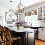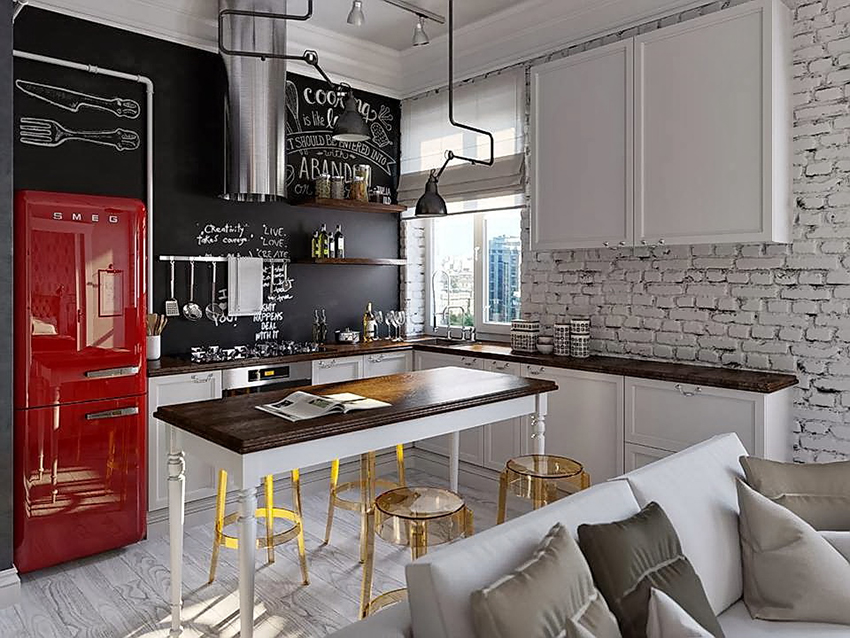بالنظر إلى صورة تصميمات مجموعات المطبخ لمطبخ زاوية بمساحة 12 مترًا مربعًا ، يمكنك ملاحظة أن الجزيرة ليست مساحة مخصصة فحسب ، بل هي أيضًا جزء من مثلث عمل وظيفي ، وهي أيضًا بمثابة طاولة بار مزينة بأكواب للزجاجات والزجاجات.