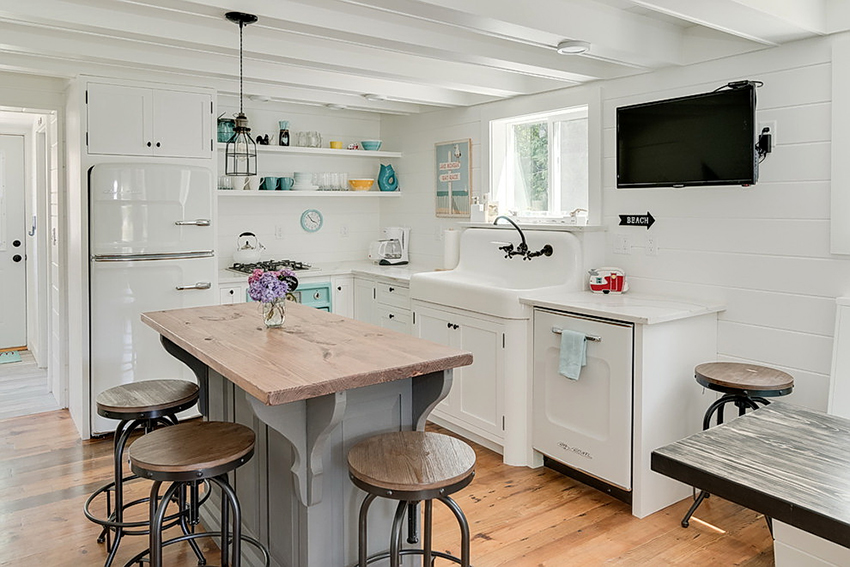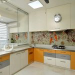 في معظم الحالات ، يتم وضع زاوية في مطبخ صغير بمحاذاة الحائط مع فتح نافذة ، مما يزيد من مساحة سطح العمل بسبب عتبة النافذة أو طاولة البار. في هذه الحالة ، يوصى بإعطاء الأفضلية للجزيرة المتنقلة ، والتي يمكن أن تلعب دور سطح العمل وطاولة الطعام.