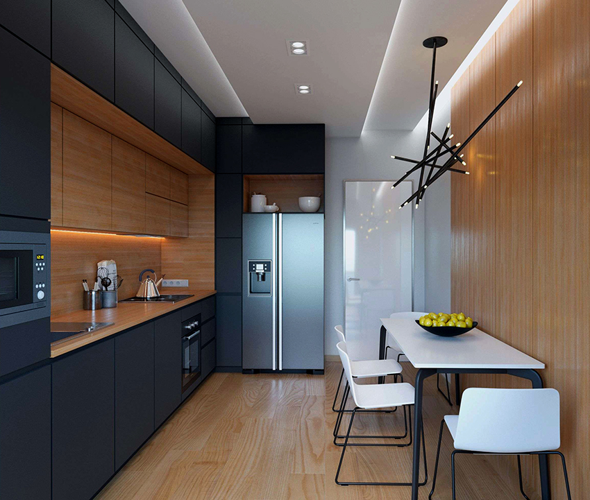 الحل الجيد هو استخدام تركيبات الإضاءة المدمجة في الأثاث ، والتي تضيء المساحة بشكل إضافي وتزيد المساحة بصريًا. كلما زادت عناصر الإضاءة المدمجة ، كان ذلك أفضل. في المطبخ الصغير ، يجب ألا تكون هناك مناطق مظلمة ، لنفس السبب لا ينصح باستخدام واجهات مظلمة فيه.