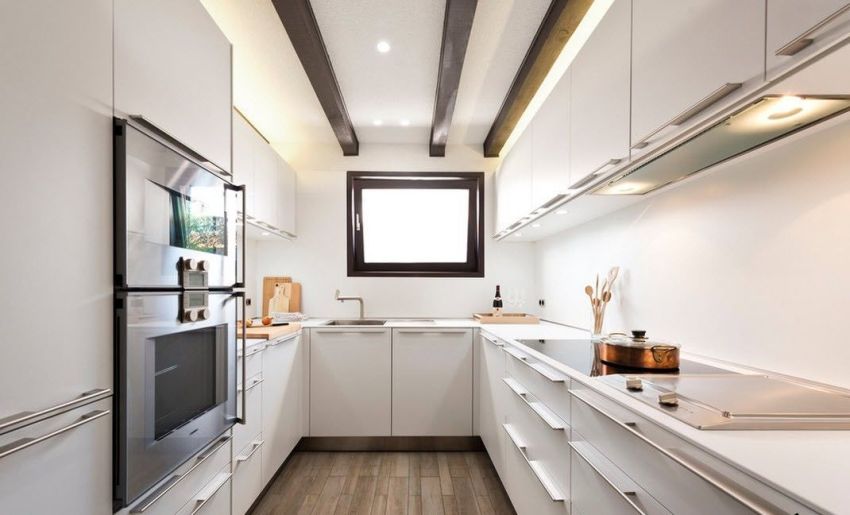 إذا كانت معلمات الغرفة تختلف عن الأحجام القياسية ، وكان المطبخ نفسه به تكوين خاطئ ، فمن الأفضل التركيز على الفور على خيار الأثاث المصنوع حسب الطلب.