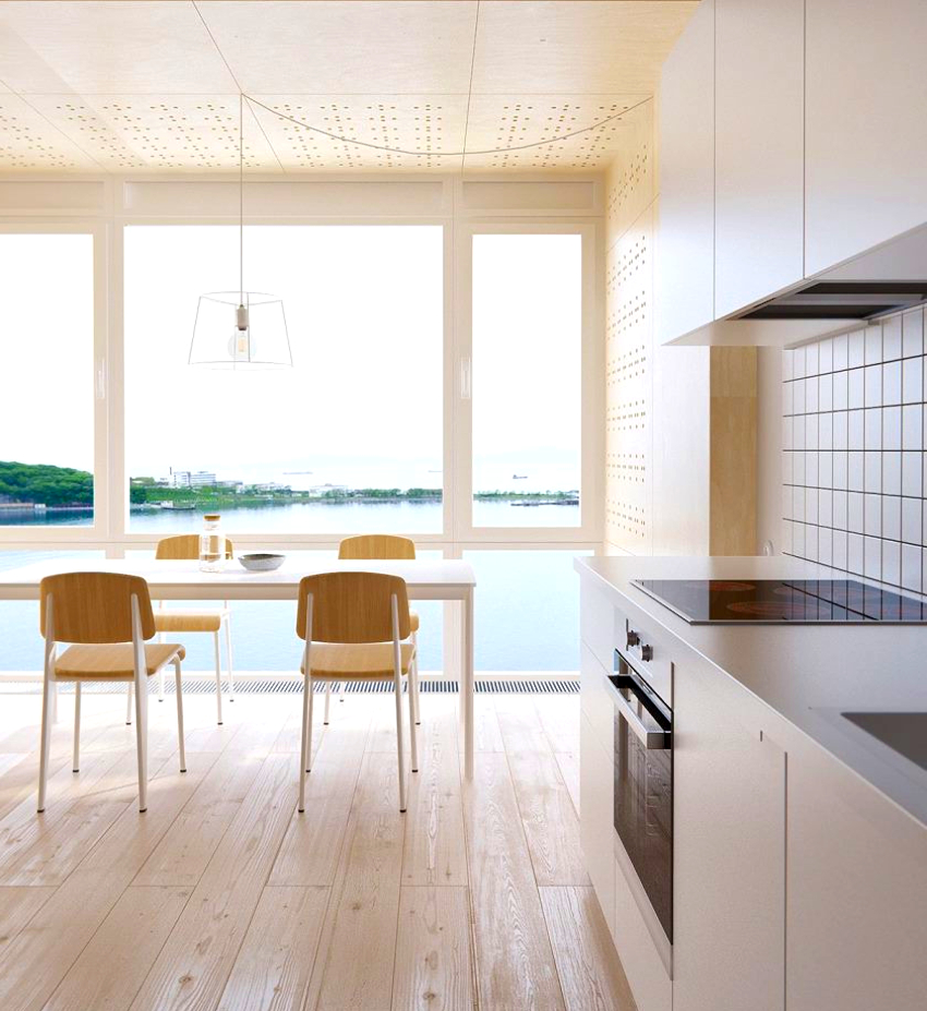 تجتمع الخطوط المستقيمة والأنسجة الناعمة والألوان الصلبة لخلق جو هادئ. نظرًا لنقص الديكور والعناصر البارزة ، فإن المطبخ البسيط سهل التنظيف وبسيط ، مما يعني أن النظام والانسجام سيسودان دائمًا هنا.