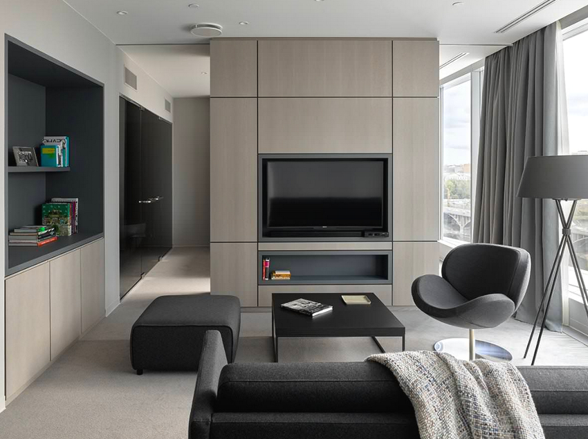يجب التفكير في تصميم القاعة بأسلوب التبسيط بأدق التفاصيل. يجب أن تجمع الغرفة بشكل متناغم بين المساحة المفتوحة والأشكال والوظائف الصارمة.