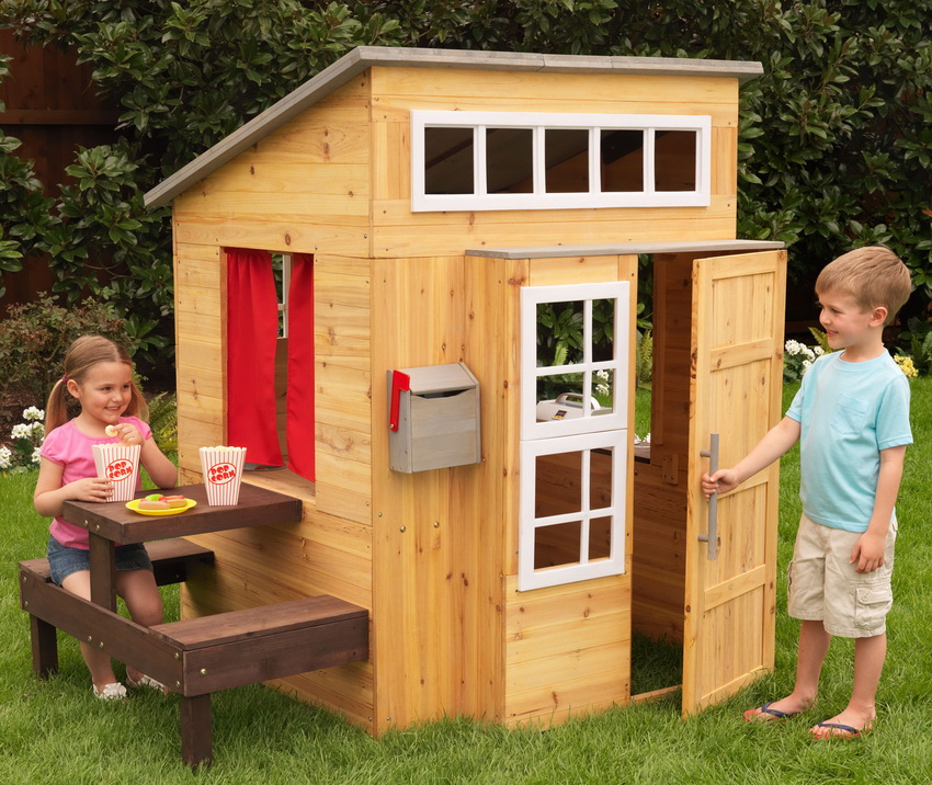 - Дървените къщички за деца са подходящи за тези, които имат собствена градина в лятната си вила. В просторен двор конструкцията може да се монтира, без да се жертва място. Тази опция е най-близо до истинския дом. Такава структура изисква специални грижи, вентилация, третиране с вредители, плесени и гъбички.
