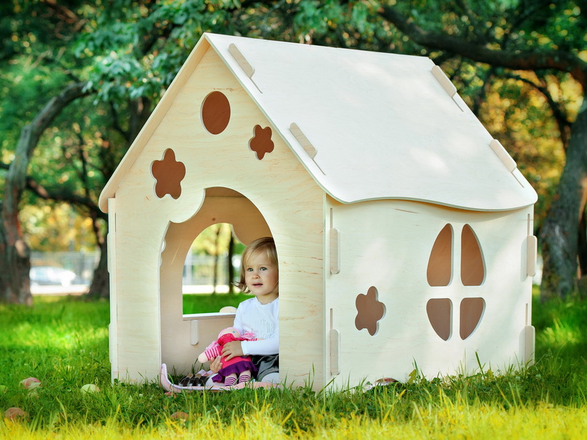 Полезен съвет! Панелна къща, обшита с шперплат, може да бъде допълнена с декоративни елементи, изрязани с мозайка от същия материал, което ще й придаде допълнителна привлекателност и приказност. Готовият дизайн ще се превърне в гордостта на малкия собственик.