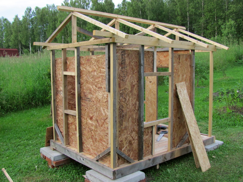 - Стени. Готовата подсилена рамка е обшита с дървен материал. За да направите това, използвайте широки дъски или плочи от ПДЧ, които са обвити с шперплат отгоре. При желание с помощта на пяна пластмаса те произвеждат вътрешна изолация на стените.