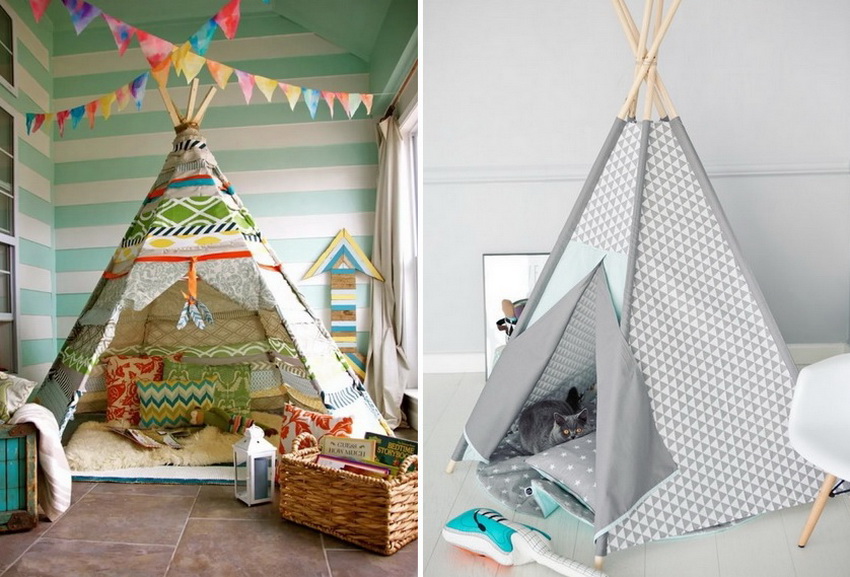 Палатка във формата на индийски вигвам е много удобна и лека конструкция, която може да се монтира в детска стая