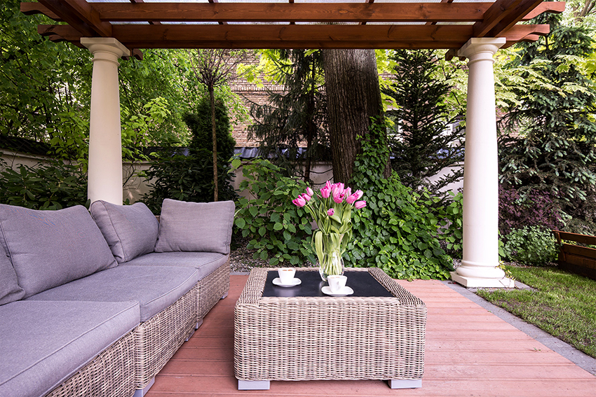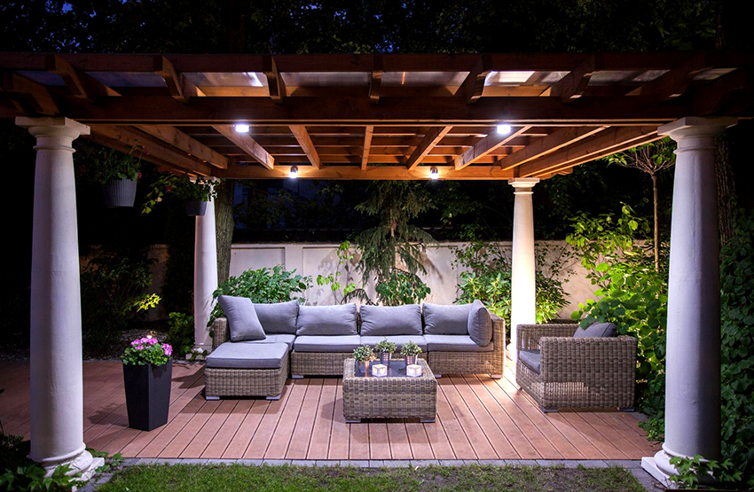 Широките дивани трябва да са пропорционални на размера на перголата, в противен случай те ще бъдат визуално притиснати. Ако се планира мека мебел, трябва да се има предвид, че тя трябва да се пере. Обикновените полиуретан и PVC издават неприятна миризма при нагряване. Мебелите от бамбук са подходящи за открити условия, но са скъпи, така че не всеки има възможност да го закупи.