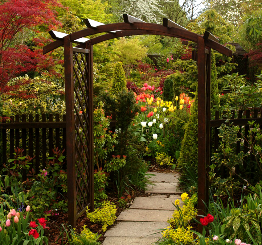 Трябва да се има предвид, че размерът влияе не само върху възприемането на структурата като част от ландшафтната композиция, но и върху избора на материал. Каменните стълбове са неподходящи за използване с малък общ размер на обекта. Опциите с ниска височина с плитка дървена решетка ще създадат усещане, подобно на кутия. Тесните арки с дебели метални или дървени подпори, предназначени да засенчват алеята, ще изпълняват основната функция, но ще бъде неудобно да се движите под тях.