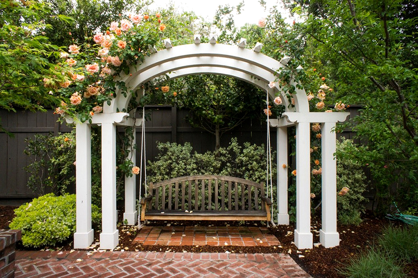Дори ако основната цел на създаването на пергола е била да поддържа катерещи се растения, оставянето на вътрешната част да не функционира не си струва. С площ от 3-4 м² и височина от 1,5-2 м, можете да поставите люлка или пейка - получавате уютен сенчест ъгъл, където можете да четете на самота или просто да се отпуснете.
