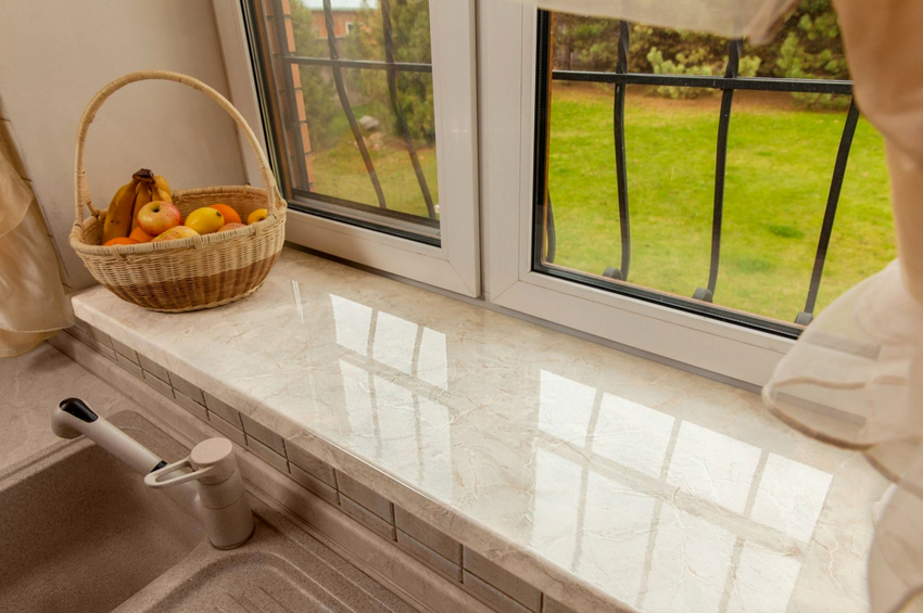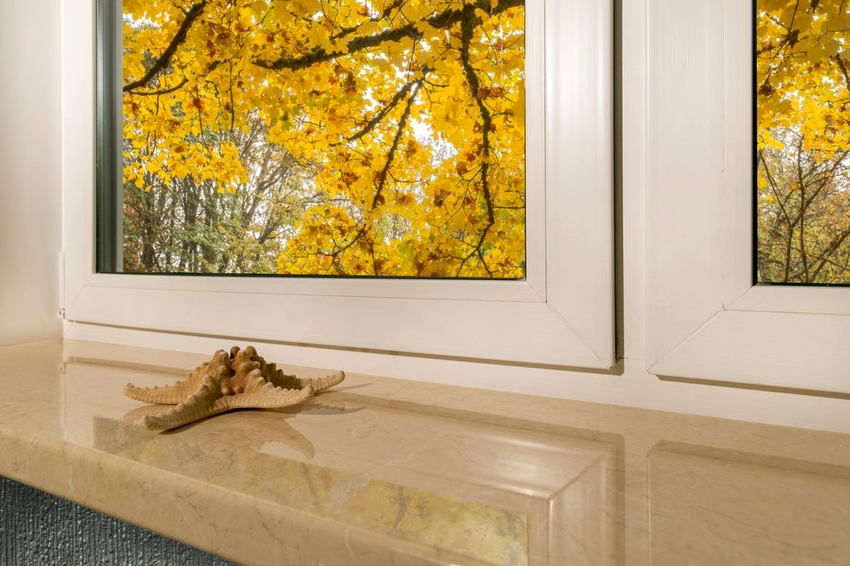 Важно! Използването на такова покритие в технологията за производство на перваза на прозореца ви позволява да получите продукт, който имитира естествен камък под формата на мрамор или гранит.