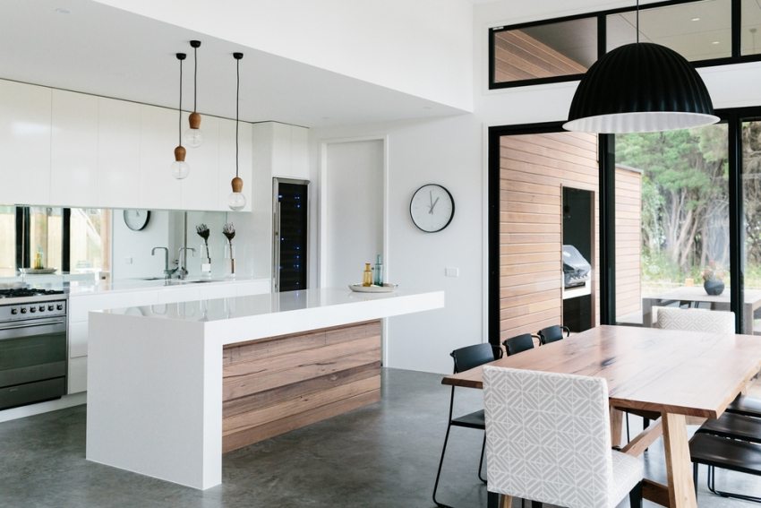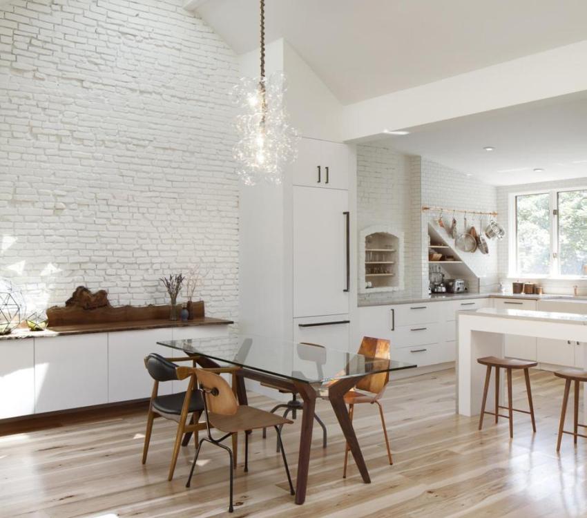 Много е важно правилно да инсталирате осветителните тела, както и да определите правилно тяхната яркост. Работната зона трябва да е добре осветена, но спокойното разсеяно осветление е по-подходящо над масата за хранене.