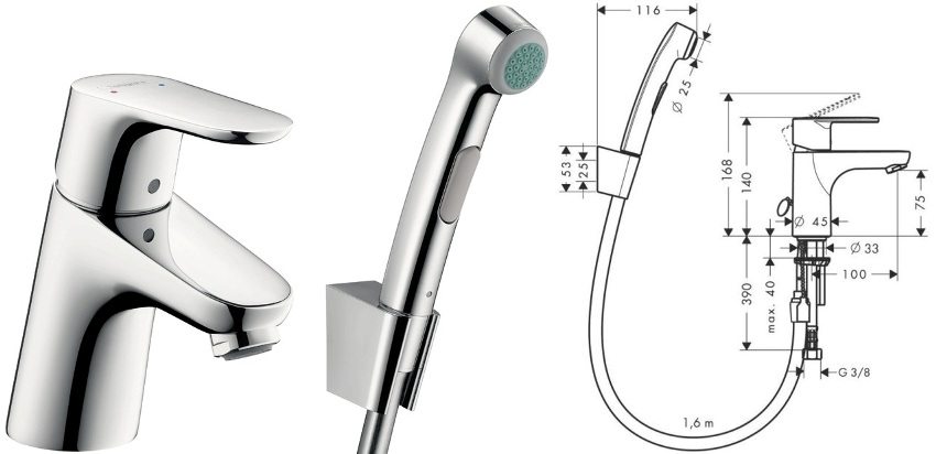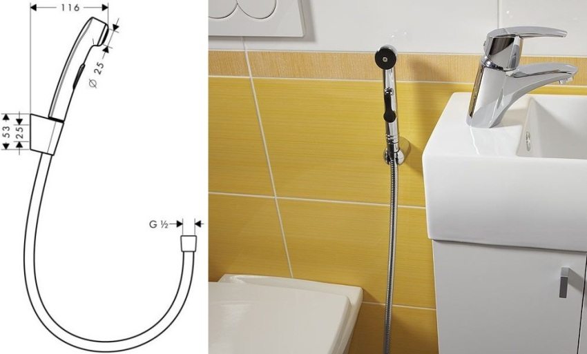 Дизайнът на кран с хигиеничен душ (снимките са представени на уебсайтовете на производителите) не се различава от конвенционалните кранове за мивки, с изключение на добавянето на маркуч с ръчен душ за хигиеничен душ. Лейката е прикрепена към стената или към тоалетното казанче, което го прави удобен за използване за хигиенни цели. Бих искал да отбележа това миксер може да функционира отделно от самия хигиеничен душ, тъй като водата се влива в душа само при натискане на бутон на душовата глава.