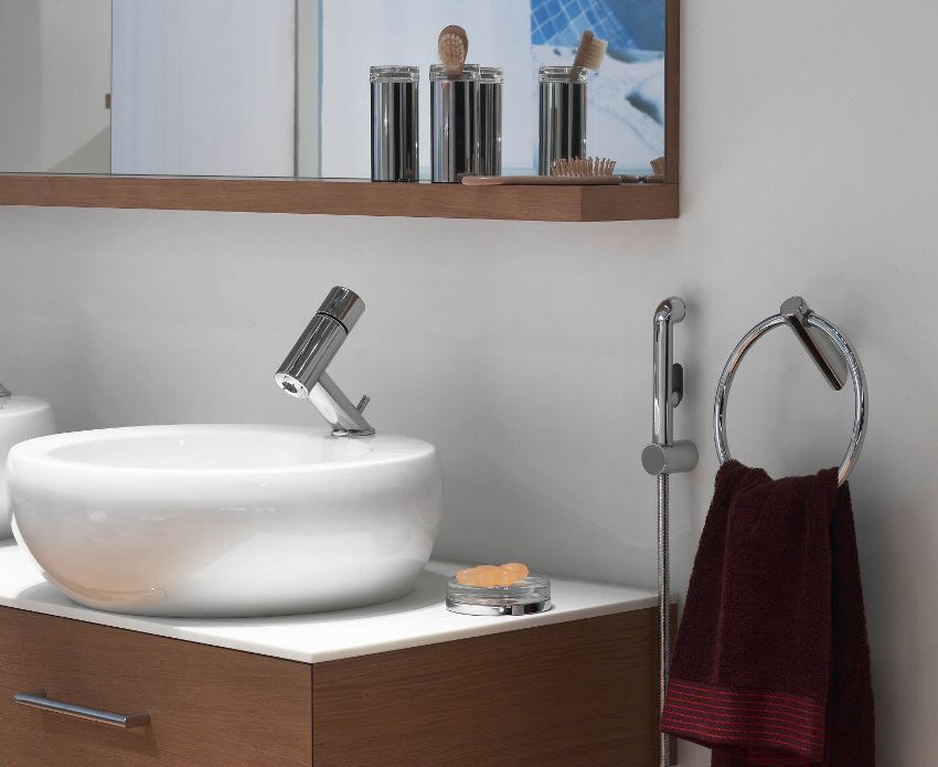 Ако зоната на банята има мивка, препоръчително е да изберете хигиеничен душ за мивка. Принципът на работа на такъв миксер с хигиеничен душ е следният: когато отворите лоста, водата влиза умивалник през чучура на крана и в маркуча за душ. Но спирателният клапан предотвратява изтичането на вода от душовата глава, докато не натиснете бутона на душовата глава. Щом водата изтича от лейката, тя спира да се излива от чучура на смесителя. Този принцип на работа позволява във всеки случай да се затвори водата след процедурите с помощта на лост.