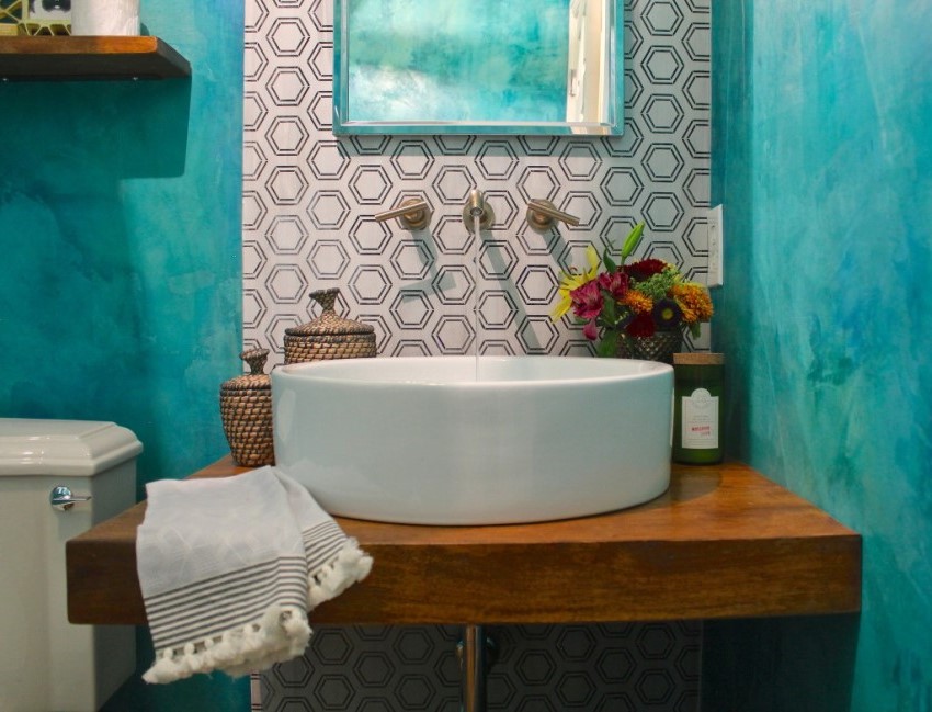 Декоративната мазилка може да се използва за декорация на стените в банята, заедно с оцветяващи съединения. Тези материали са перфектно съчетани помежду си, създавайки ефективни комбинации.