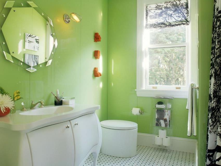 Стилове като Art Deco и Pop Art се основават на необичайни наситени цветове. Яркозелената баня ще бъде идеално допълнение към весели снимки или рисунки от комикси.