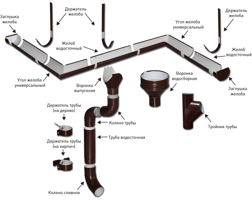 Els sistemes de drenatge, independentment del material de fabricació, consten dels mateixos elements. Hi ha canalons al terrat, que s’uneixen amb connectors i suports especials. A més, per al ple funcionament i aspecte atractiu del sistema, s’utilitzen racons i endolls interns.