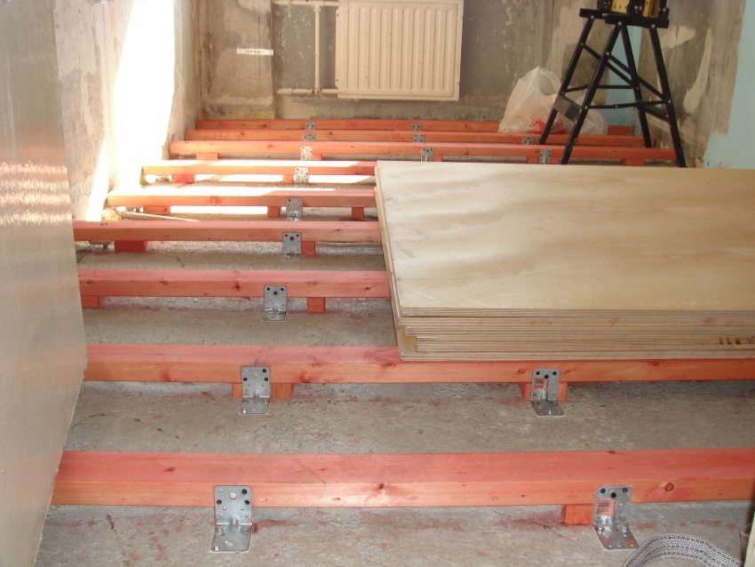 Abans d’estendre el laminat sobre un terra de fusta, podeu utilitzar l’anivellament de la superfície col·locant fusta contraxapada i fixant-lo als troncs. Aquest mètode és bastant laboriós i car. El principi d’aquest mètode és instal·lar el retard perquè les seves vores superiors estiguin en el mateix pla horitzontalment. Per aconseguir aquesta posició, es col·loquen falques o blocs de fusta sota els troncs. Quan es col·loquen biguetes ajustables, la seva posició es fixa mitjançant cargols de regulació.