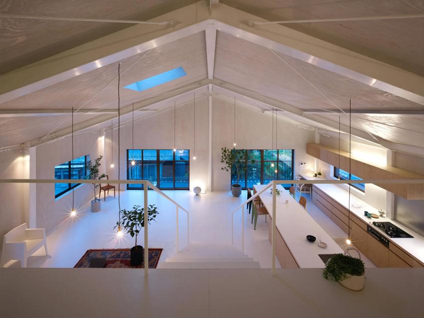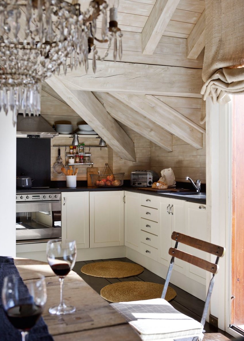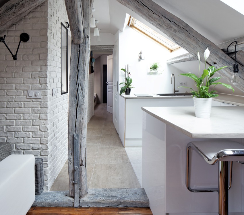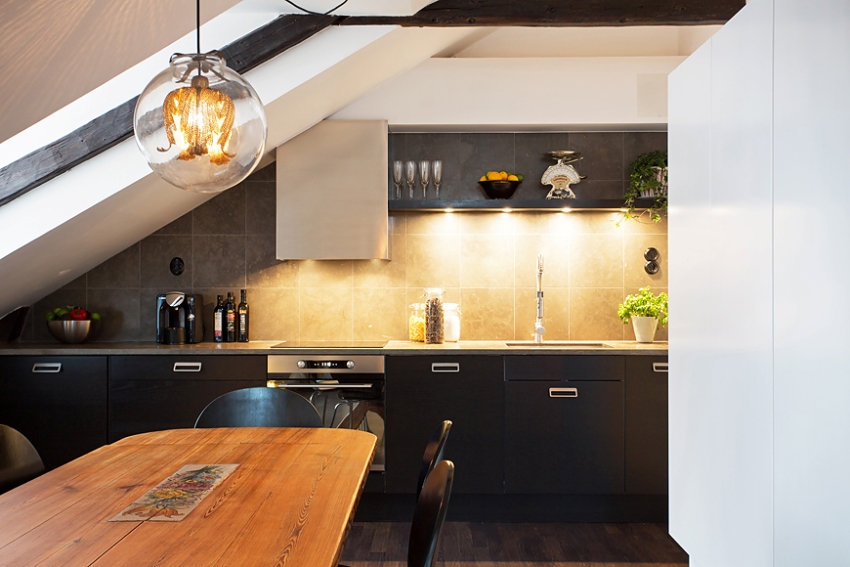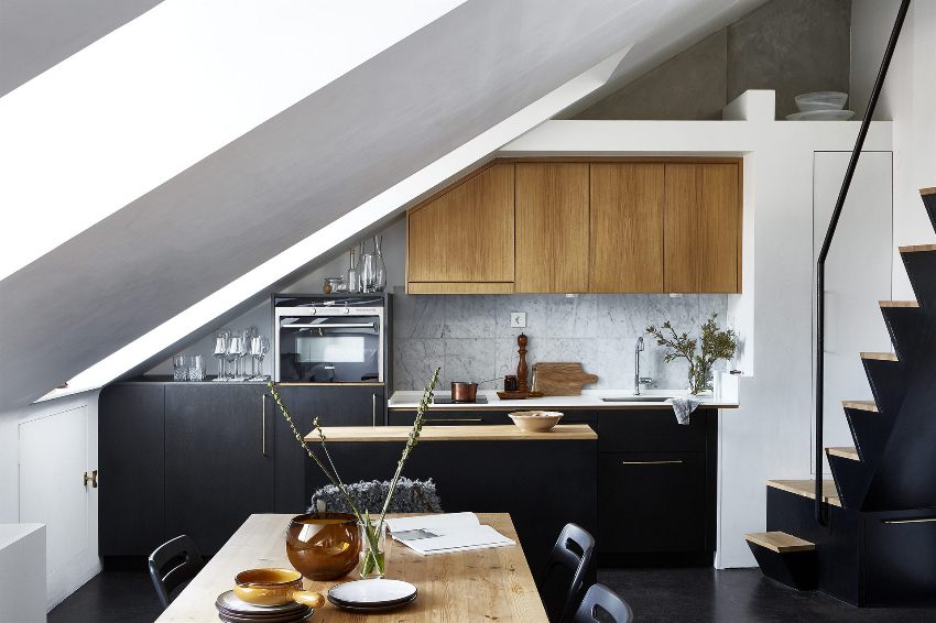 Els articles de cuina penjats al llarg de les parets inclinades de la sala tindran un aspecte original.