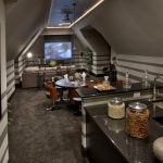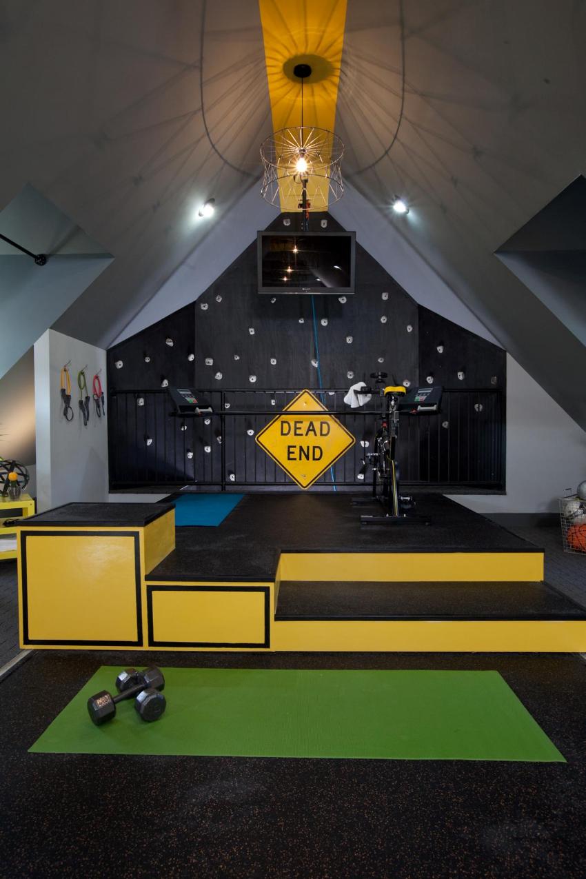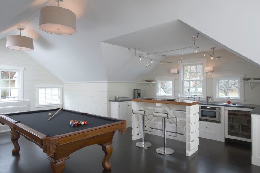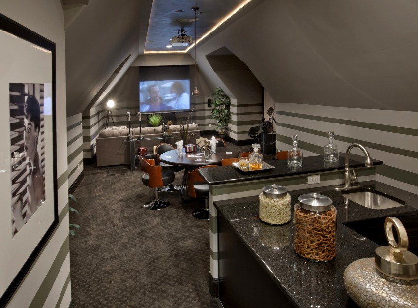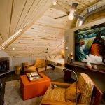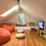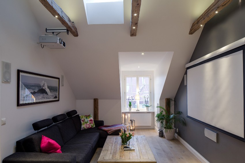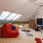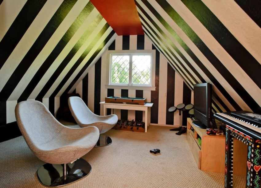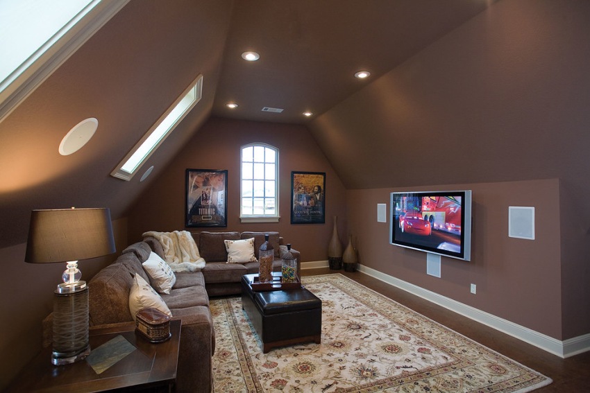També és una bona idea crear una sala de cinema a les golfes. Podreu gaudir d’una imatge i un so de qualitat en pau, ja que el televisor no estarà ple de mobles. Podeu utilitzar un sofà, poufs suaus o bosses de fesols com a seients per als espectadors. Si es desitja, el cinema a casa es pot equipar amb llocs reclinables: una moqueta esponjosa i molts coixins suaus.