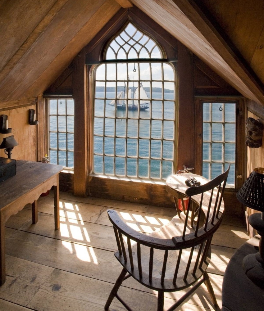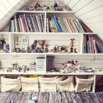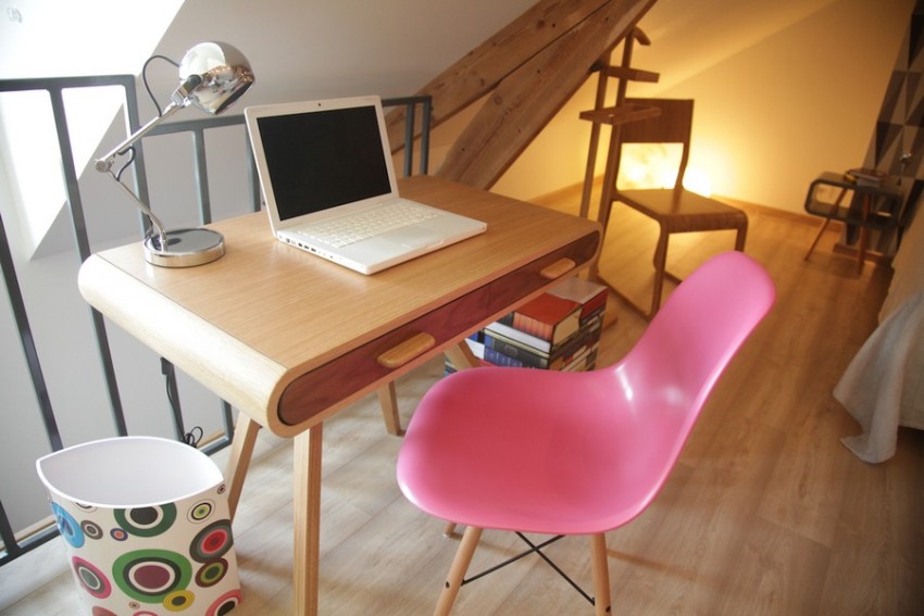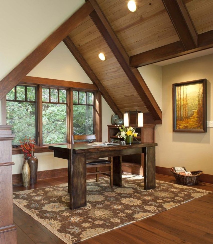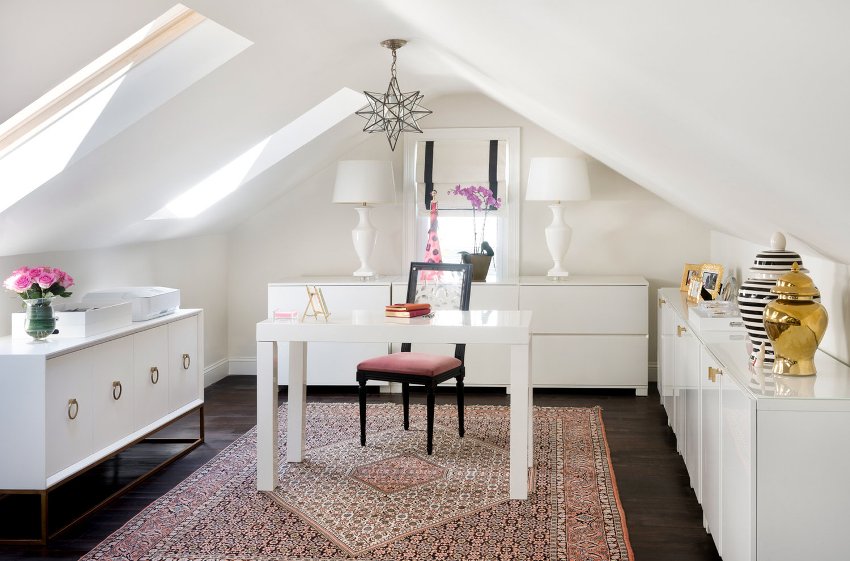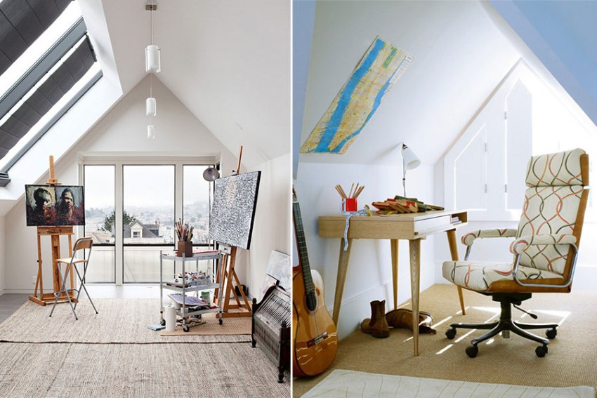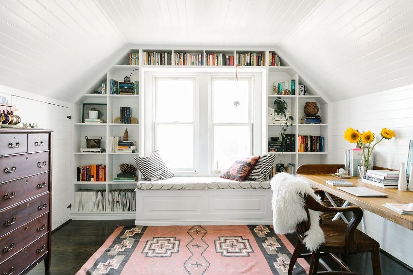 En una petita casa privada, sovint és força difícil assignar una habitació independent per a una oficina o taller.Per a això, les golfes són perfectes, cosa que us permetrà retirar-vos del vostre passatemps favorit, treballar o simplement llegir llibres. Fins i tot una petita habitació pot allotjar fàcilment el conjunt de mobles necessaris i, amb espai il·limitat, hi ha un lloc per a una prestatgeria enorme amb llibres, una balancina a prop d’un llum de peu a la cantonada, un enorme sofà suau.