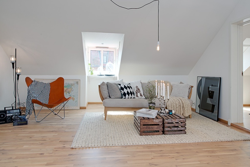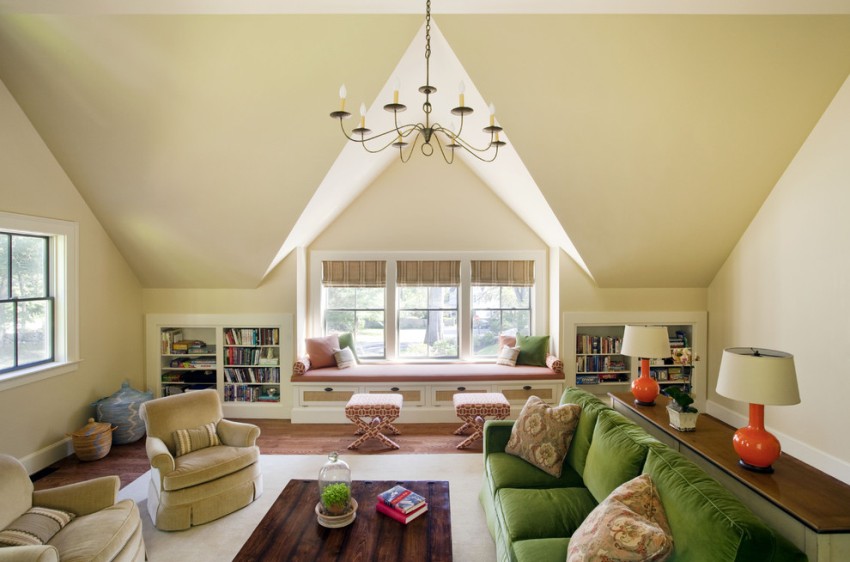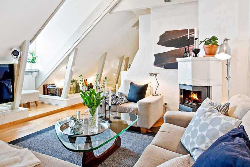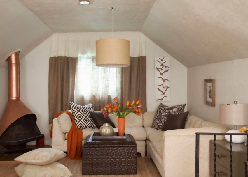 Es necessitarà un mínim d’esforç per equipar una sala d’estar acollidora i confortable a les golfes, el més important és que l’habitació sigui àmplia. Dissenyat amb cura, qualsevol habitació es pot transformar en una encantadora zona de recepció.