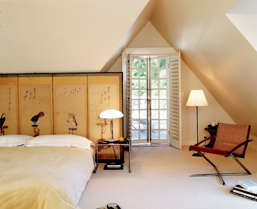 Interessant disseny dormitori de les golfes amb paper pintat de serigrafia i pals de bambú