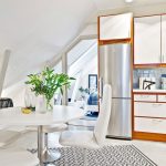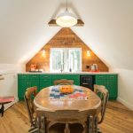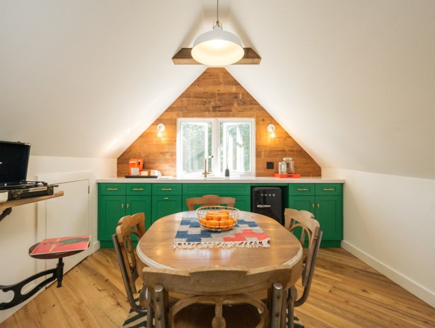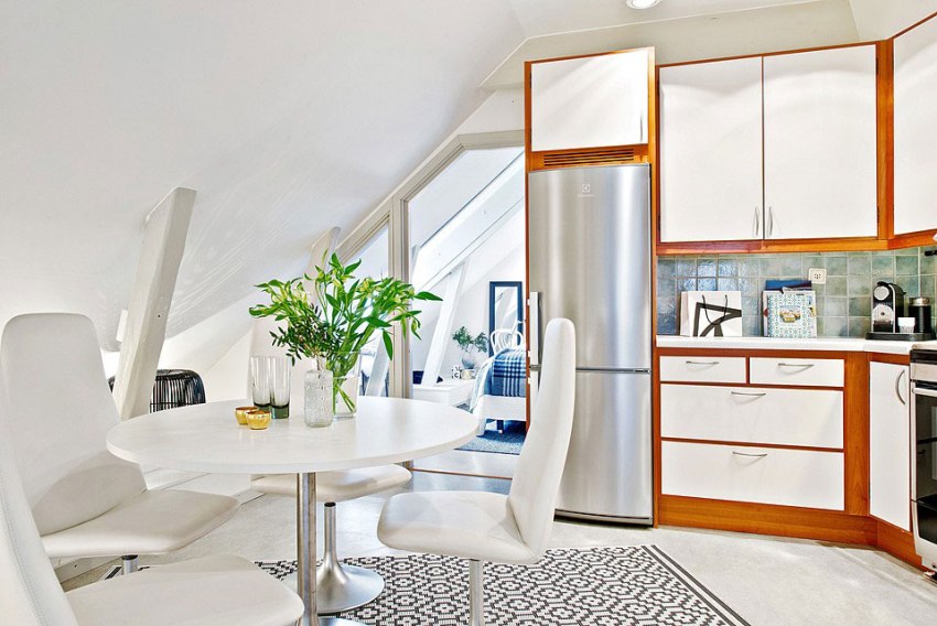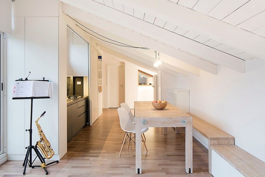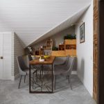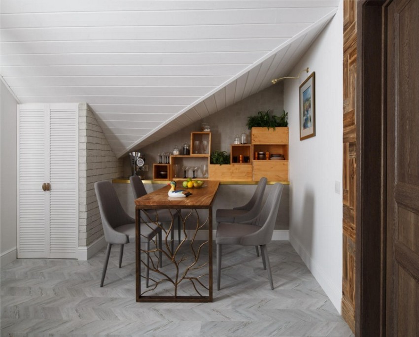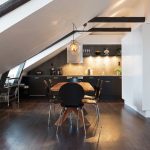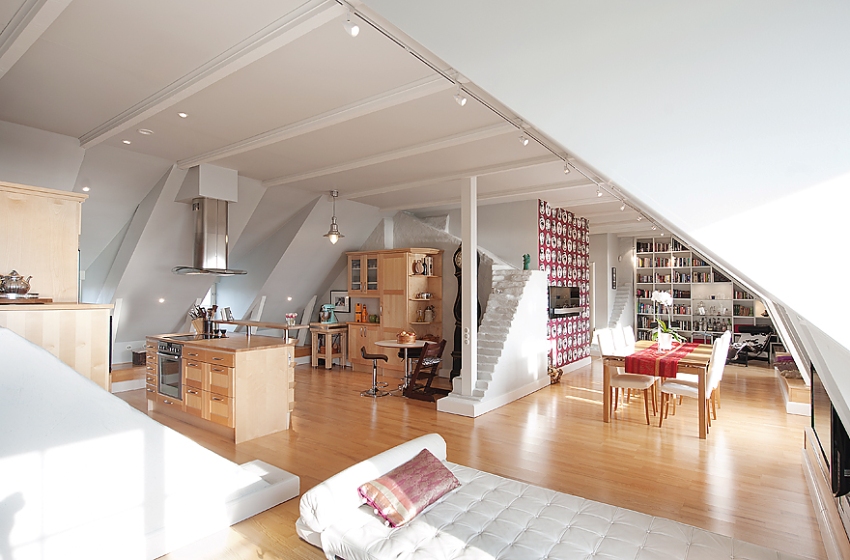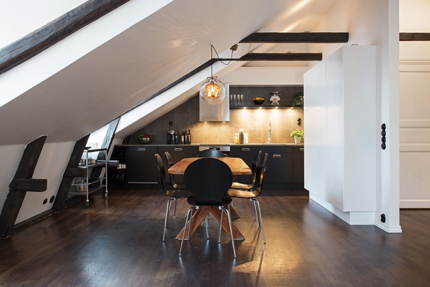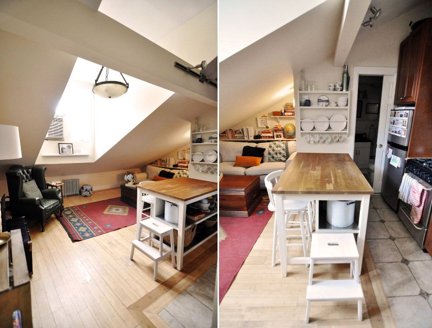 Consells útils! Al pis de les golfes amb teulada a dues aigües o en forma de tenda de campanya, és més lògic col·locar la taula de menjador al centre sota la part més alta del sostre.