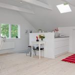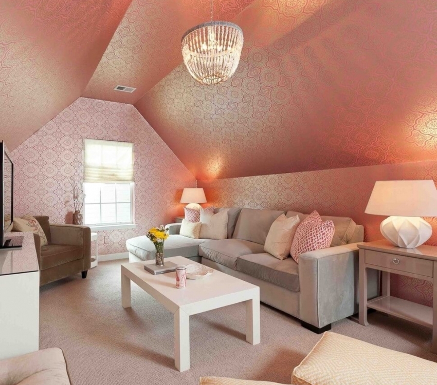 Els colors foscos i els grans patrons no són molt adequats per a un àtic petit. El millor és utilitzar un fons de pantalla blanc. Podeu afegir colors amb l’ajut de mobles de colors delicats i accessoris brillants.