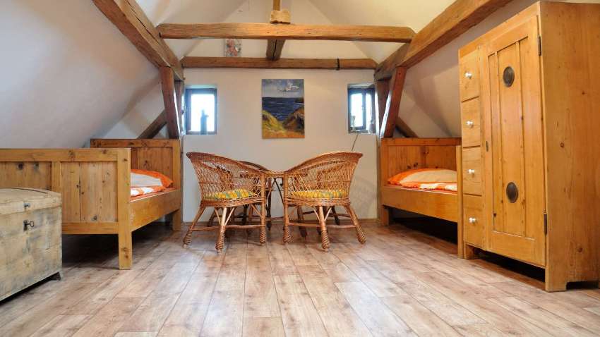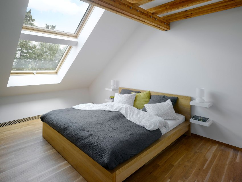 En funció del grau d’inclinació del sostre, la sala de les golfes s’adapta a diferents usos. L’angle baix d’inclinació fa que el loft sigui ideal per a un dormitori. A les golfes, aquesta habitació es convertirà en un lloc acollidor i romàntic. A l’habitació de les golfes es pot admirar el cel estrellat i al matí gaudir de la sortida del sol a través de les finestres del vessant del terrat. Quan plou, es garanteix un ambient especialment somiador al dormitori de les golfes.